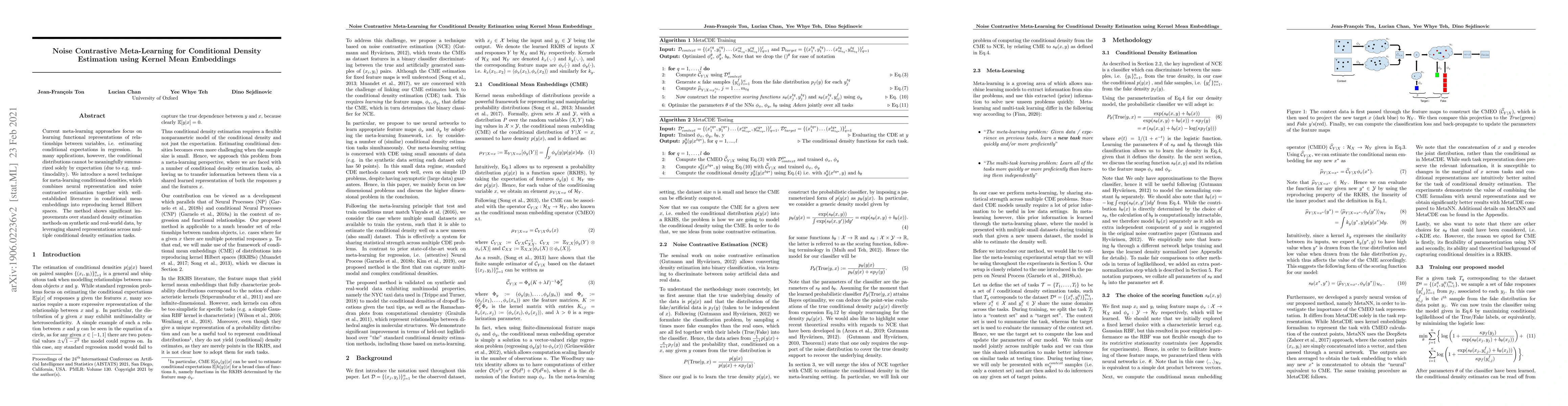 This paper introduces a novel meta-learning approach combining neural representations, noise-contrastive estimation, and kernel mean embeddings for conditional density estimation, addressing multimodal distributions beyond simple regression. The method is validated on both synthetic and real-world data, showing the effectiveness of shared representations across diverse density estimation tasks.