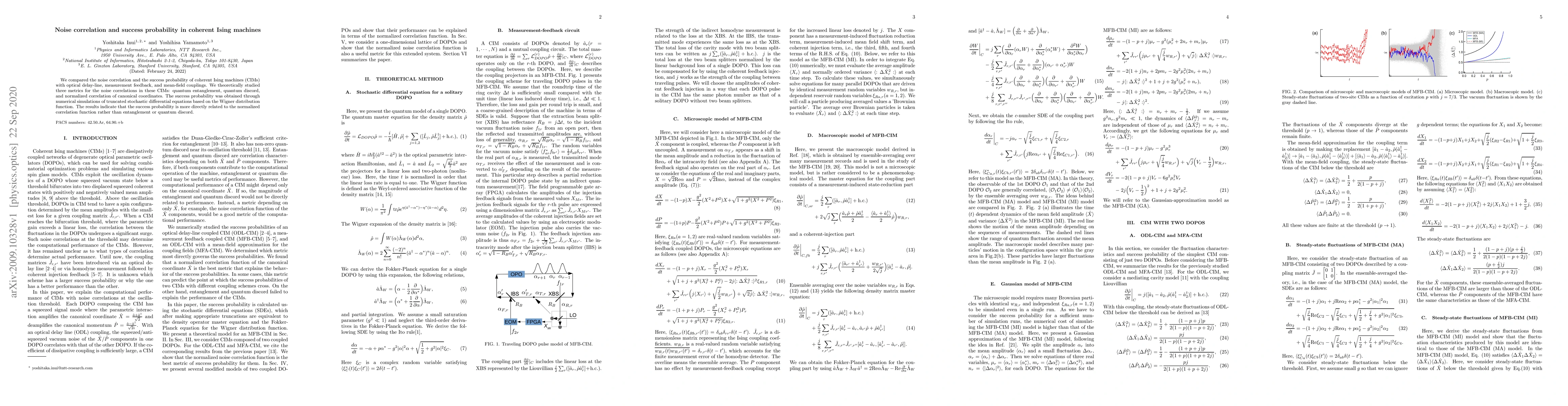This paper investigates noise correlation and success probability in coherent Ising machines (CIMs) using optical delay-line, measurement feedback, and mean-field couplings. The study finds that the success probability is more closely linked to the normalized correlation of canonical coordinates than to quantum entanglement or discord, as determined through numerical simulations and theoretical metrics.