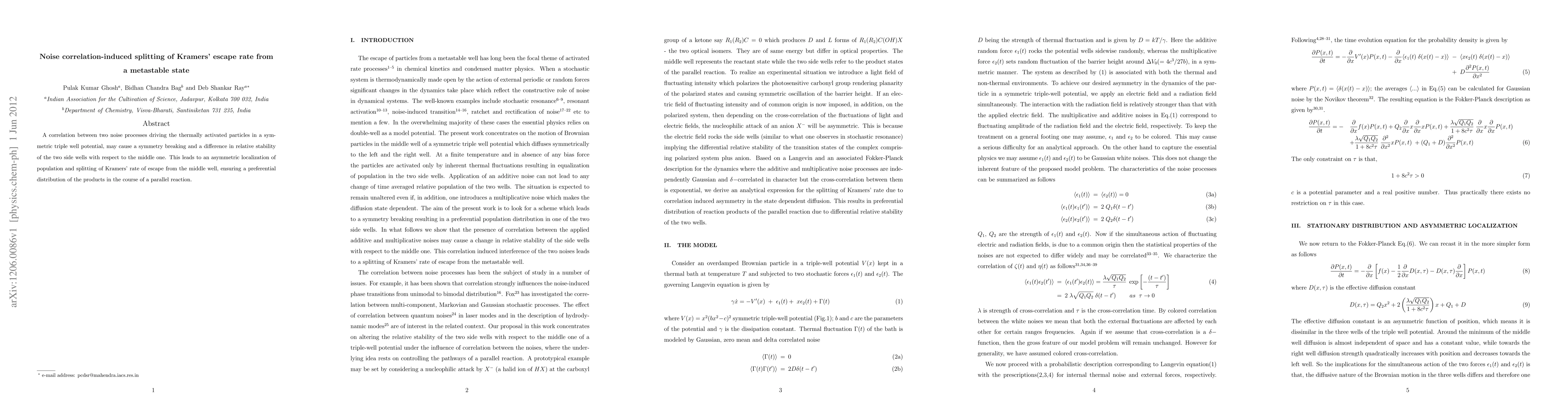 A correlation between two noise processes driving the thermally activated particles in a symmetric triple well potential, may cause a symmetry breaking and a difference in relative stability of the two side wells with respect to the middle one. This leads to an asymmetric localization of population and splitting of Kramers' rate of escape from the middle well, ensuring a preferential distribution of the products in the course of a parallel reaction.