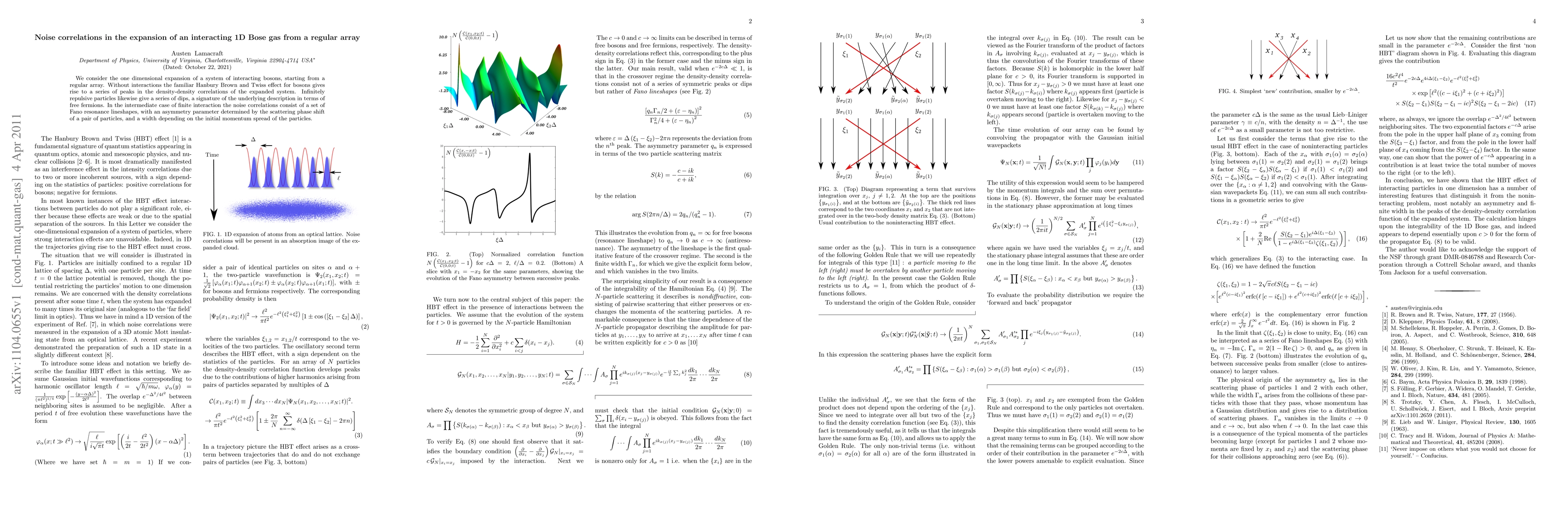 We consider the one dimensional expansion of a system of interacting bosons, starting from a regular array. Without interactions the familiar Hanbury Brown and Twiss effect for bosons gives rise to a series of peaks in the density-density correlations of the expanded system. Infinitely repulsive particles likewise give a series of dips, a signature of the underlying description in terms of free fermions. In the intermediate case of finite interaction the noise correlations consist of a set of Fano resonance lineshapes, with an asymmetry parameter determined by the scattering phase shift of a pair of particles, and a width depending on the initial momentum spread of the particles.