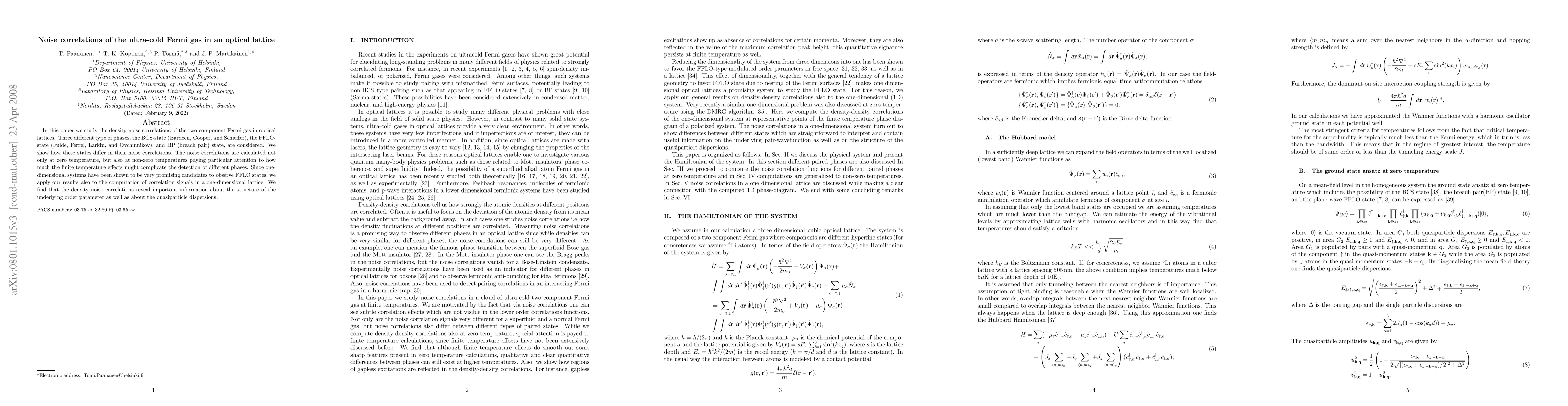This paper investigates the density noise correlations in a two-component Fermi gas within optical lattices, focusing on three distinct phases: BCS, FFLO, and BP states. It highlights how these phases differ in noise correlations, both at zero and non-zero temperatures, and discusses the implications for detecting these phases, especially in one-dimensional systems.