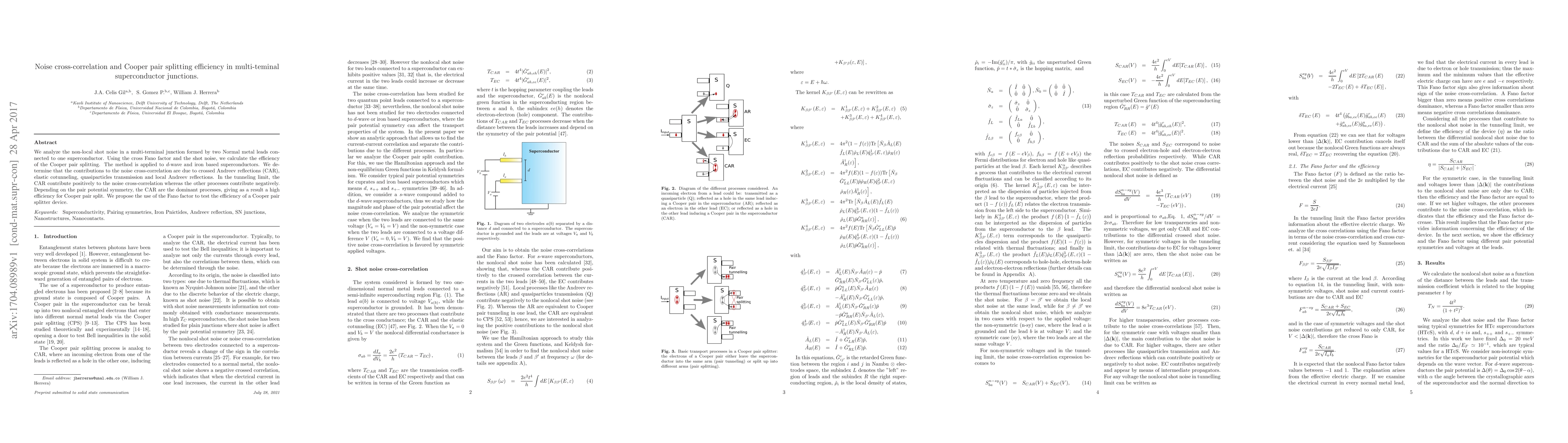 This research investigates the non-local shot noise in multi-terminal superconductor junctions, calculating Cooper pair splitting efficiency using cross Fano factor and shot noise. The study finds that crossed Andreev reflections are the dominant process in d-wave and iron-based superconductors, proposing the Fano factor as a measure for Cooper pair splitter device efficiency.