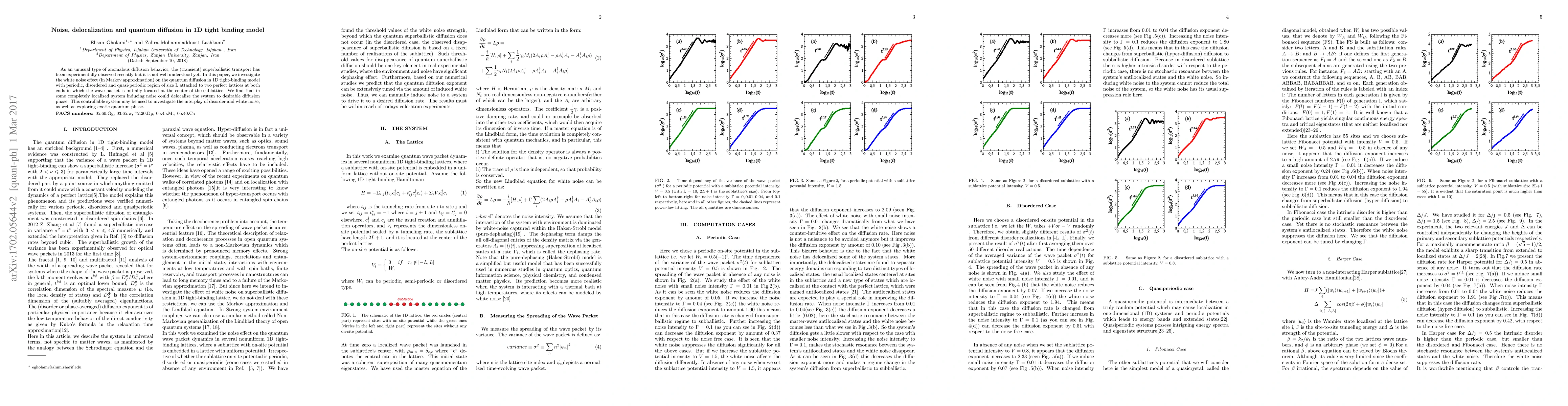 This paper explores the effect of white noise on quantum diffusion in a 1D tight-binding model with periodic, disordered, and quasi-periodic regions. It finds that noise can delocalize a completely localized system, inducing a desirable diffusion phase, which may help in studying the interplay of disorder and noise in quantum systems.