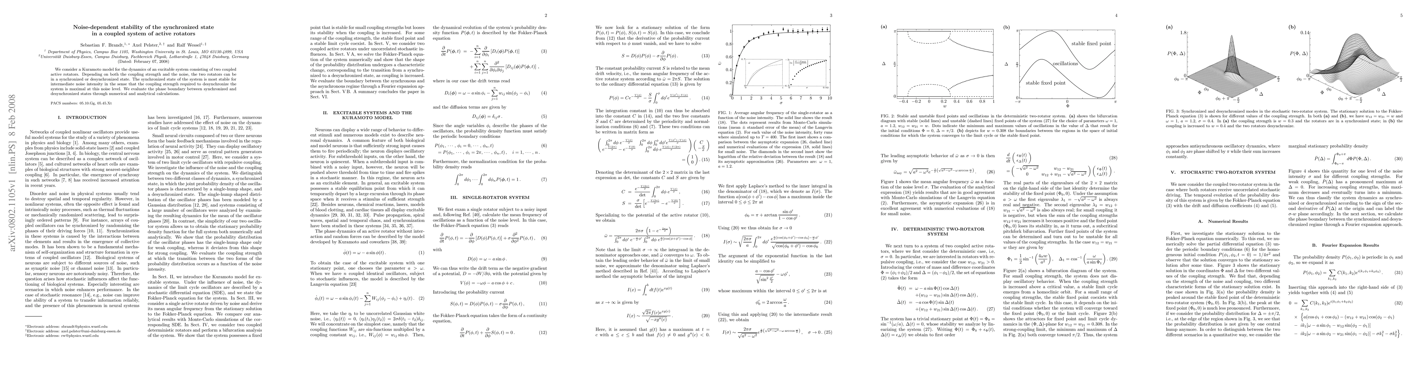 This paper investigates the Kuramoto model for a system of two coupled active rotators, finding that intermediate noise intensity maximizes the stability of the synchronized state. The study uses both numerical and analytical methods to determine the phase boundary between synchronized and desynchronized states.