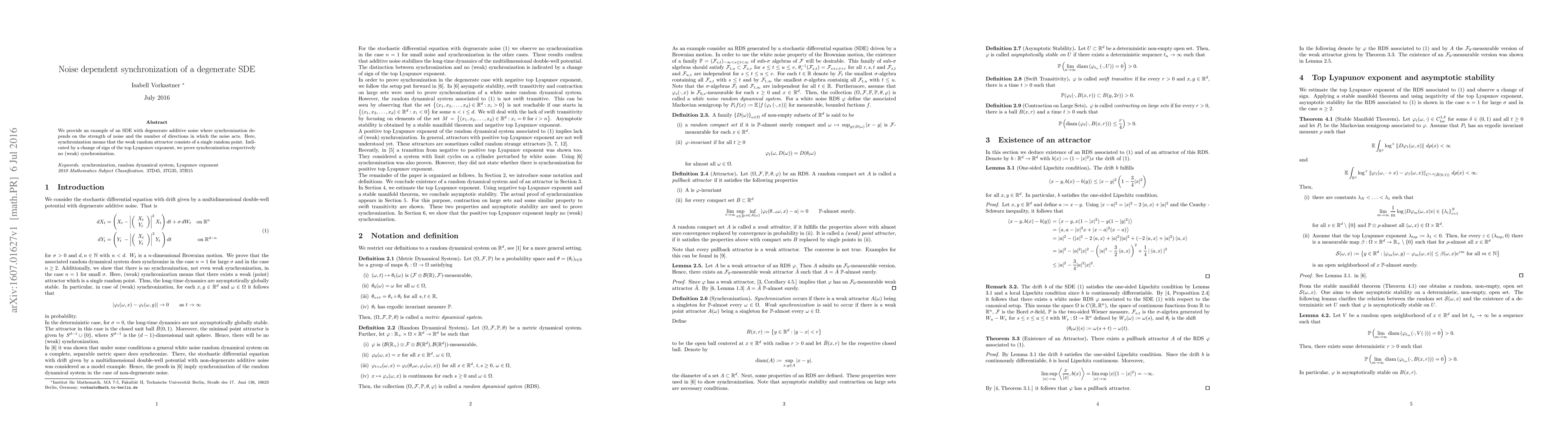 We provide an example of an SDE with degenerate additive noise where synchronization depends on the strength of noise and the number of directions in which the noise acts. Here, synchronization means that the weak random attractor consists of a single random point. Indicated by a change of sign of the top Lyapunov exponent, we prove synchronization respectively no (weak) synchronization.