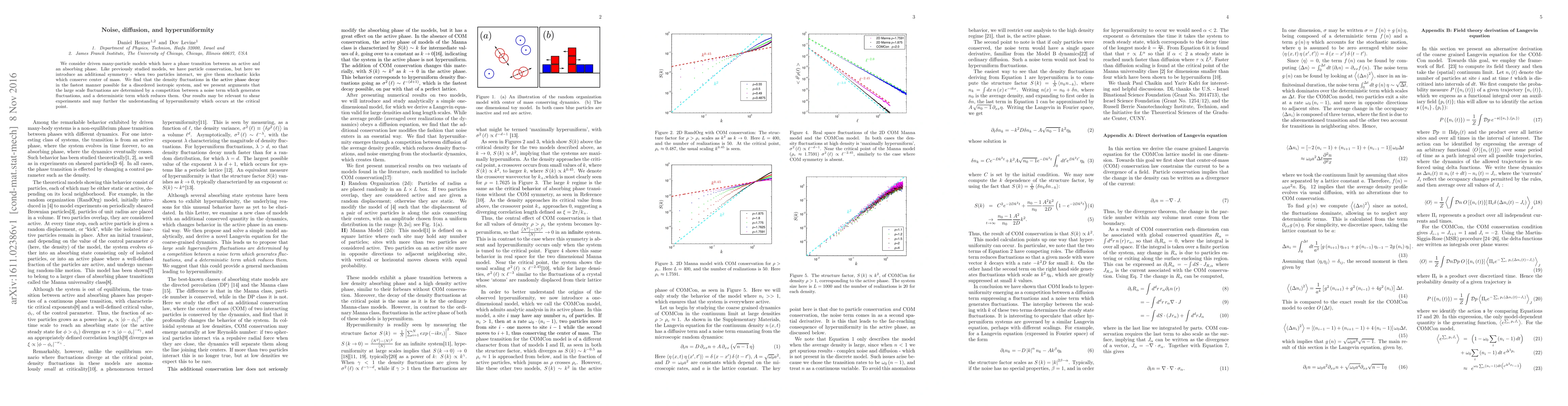 We consider driven many-particle models which have a phase transition between an active and an absorbing phase. Like previously studied models, we have particle conservation, but here we introduce an additional symmetry - when two particles interact, we give them stochastic kicks which conserve center of mass. We find that the density fluctuations in the active phase decay in the fastest manner possible for a disordered isotropic system, and we present arguments that the large scale fluctuations are determined by a competition between a noise term which generates fluctuations, and a deterministic term which reduces them. Our results may be relevant to shear experiments and may further the understanding of hyperuniformity which occurs at the critical point.