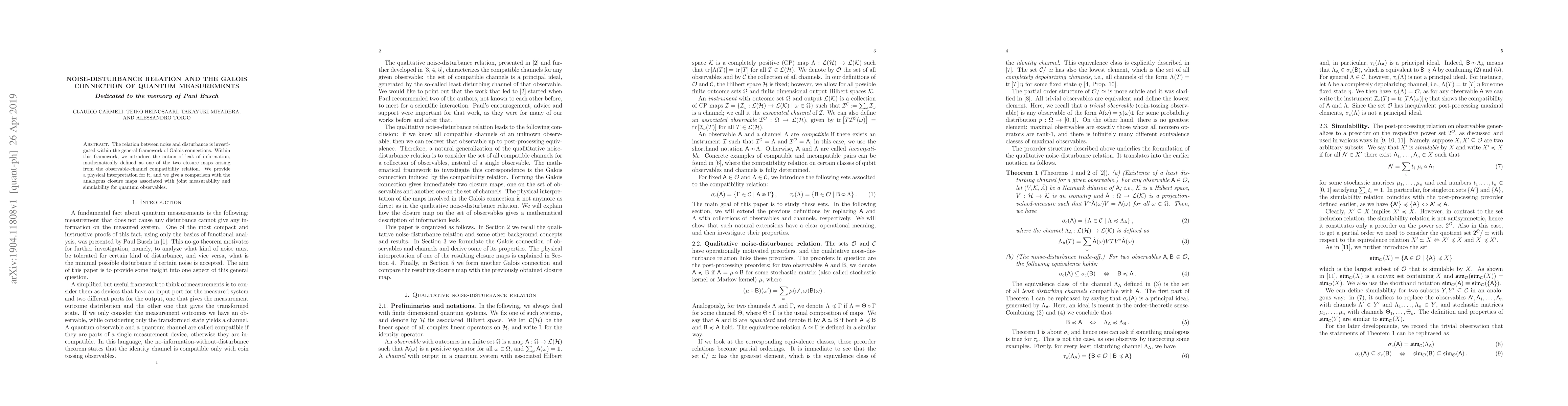 This paper explores the relationship between noise and disturbance in quantum measurements using Galois connections, introducing the concept of information leak as a closure map. It provides a physical interpretation of this leak and compares it to the closure maps related to joint measurability and simulability of quantum observables.