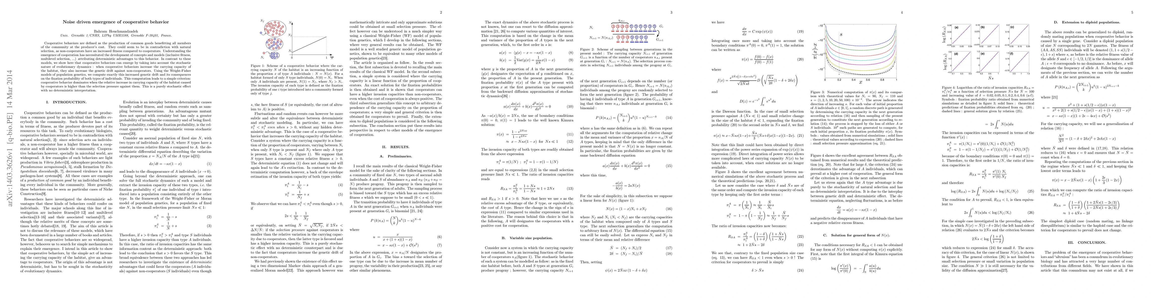 Cooperative behaviors are defined as the production of common goods benefitting all members of the community at the producer's cost. They could seem to be in contradiction with natural selection, as non-cooperators have an increased fitness compared to cooperators. Understanding the emergence of cooperation has necessitated the development of concepts and models (inclusive fitness, multilevel selection, ...) attributing deterministic advantages to this behavior. In contrast to these models, we show here that cooperative behaviors can emerge by taking into account the stochastic nature of evolutionary dynamics : when cooperative behaviors increase the carrying capacity of the habitat, they also increase the genetic drift against non-cooperators. Using the Wright-Fisher models of population genetics, we compute exactly this increased genetic drift and its consequences on the fixation probability of both types of individuals. This computation leads to a simple criterion: cooperative behavior dominates when the relative increase in carrying capacity of the habitat caused by cooperators is higher than the selection pressure against them. This is a purely stochastic effect with no deterministic interpretation.