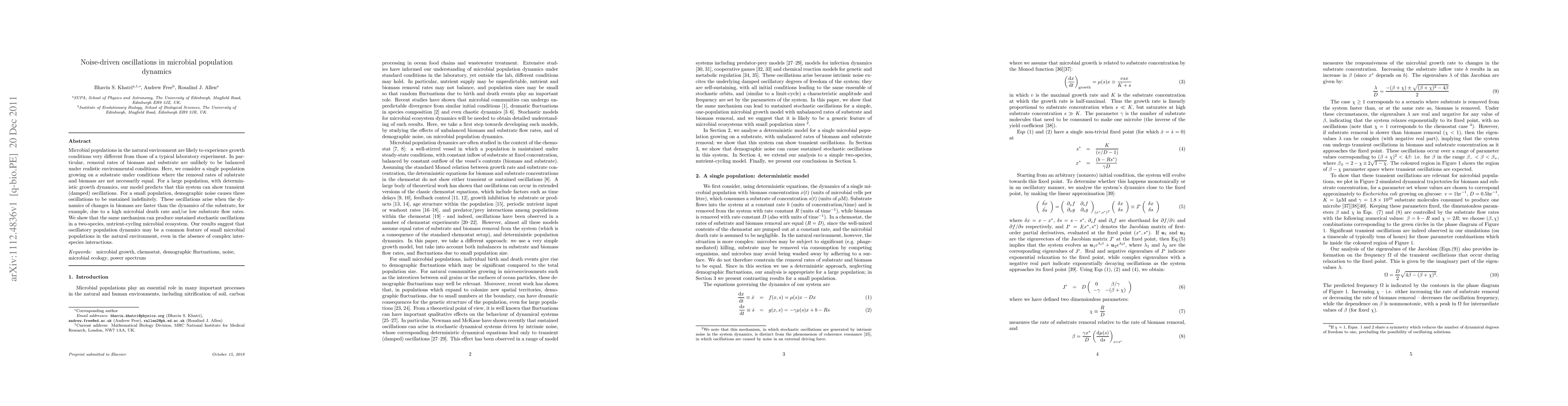 This paper explores how demographic noise in microbial populations can lead to sustained oscillations in growth dynamics when removal rates of substrate and biomass differ, especially in small populations. The findings suggest that such oscillations may frequently occur in natural microbial ecosystems, driven by faster biomass dynamics relative to substrate availability.