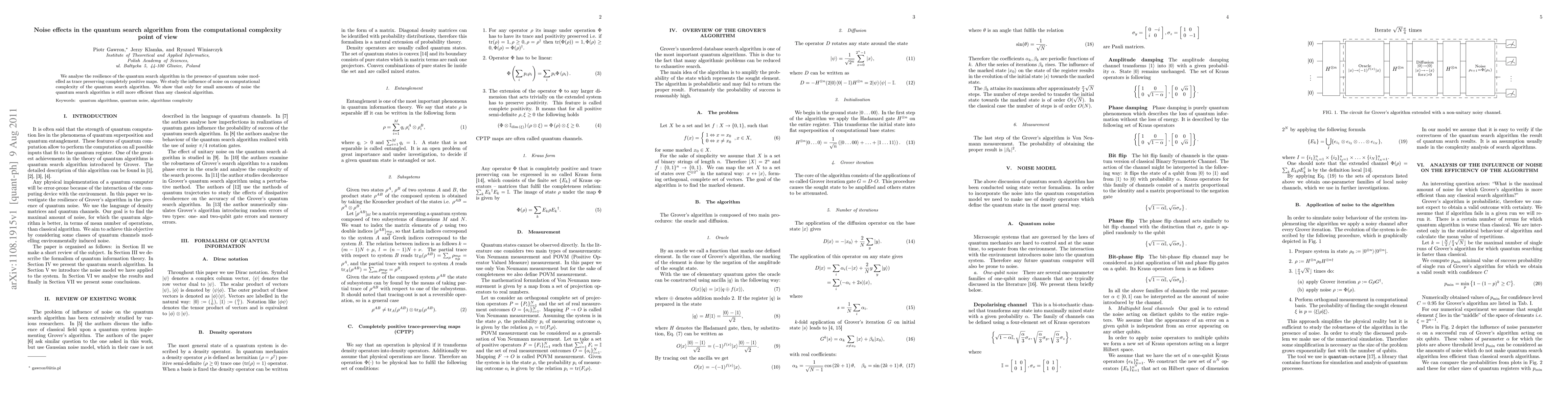 This paper examines how quantum noise impacts the efficiency of the quantum search algorithm, demonstrating that only minimal noise levels preserve its computational advantage over classical algorithms. The study uses trace preserving completely positive maps to model quantum noise.
