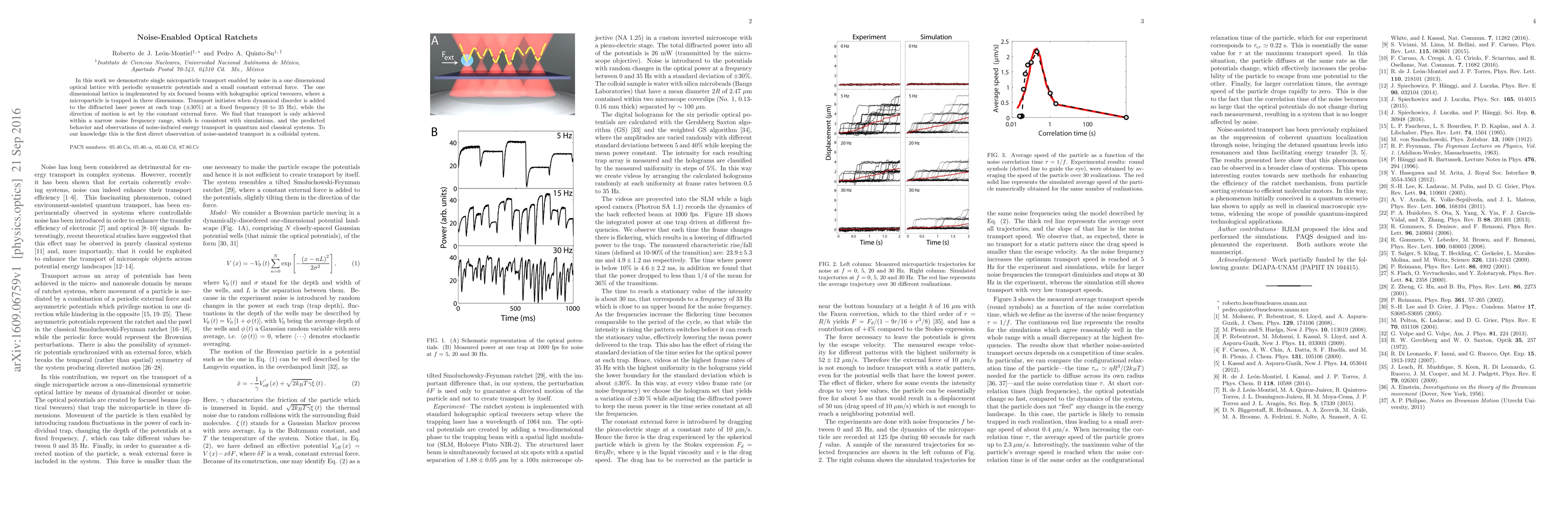 In this work we demonstrate single microparticle transport enabled by noise in a one dimensional optical lattice with periodic symmetric potentials and a small constant external force. The one dimensional lattice is implemented by six focused beams with holographic optical tweezers, where a microparticle is trapped in three dimensions. Transport initiates when dynamical disorder is added to the diffracted laser power at each trap ($\pm 30\%$) at a fixed frequency (0 to 35 Hz), while the direction of motion is set by the constant external force. We find that transport is only achieved within a narrow noise frequency range, which is consistent with simulations, and the predicted behavior and observations of noise-induced energy transport in quantum and classical systems. To our knowledge this is the first direct observation of noise-assisted transport in a colloidal system.