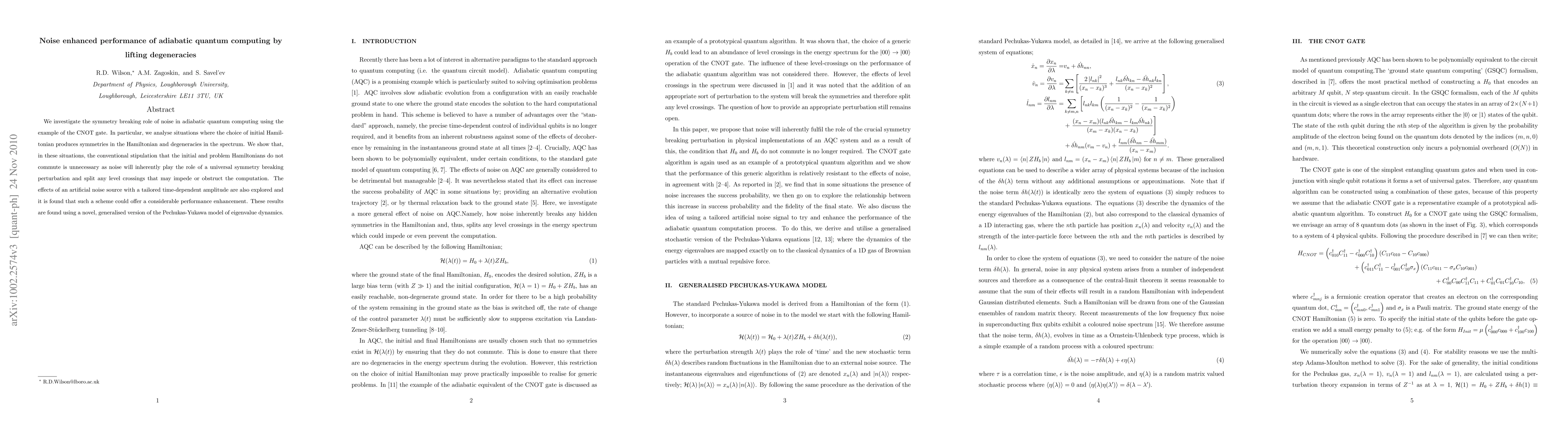We investigate the symmetry breaking role of noise in adiabatic quantum computing using the example of the CNOT gate. In particular, we analyse situations where the choice of initial configuration leads to symmetries in the Hamiltonian and degeneracies in the spectrum. We show that, in these situations, there exists an optimal level of noise that maximises the success probability and the fidelity of the final state. The effects of an artificial noise source with a time-dependent amplitude are also explored and it is found that such a scheme would offer a considerable performance enhancement.