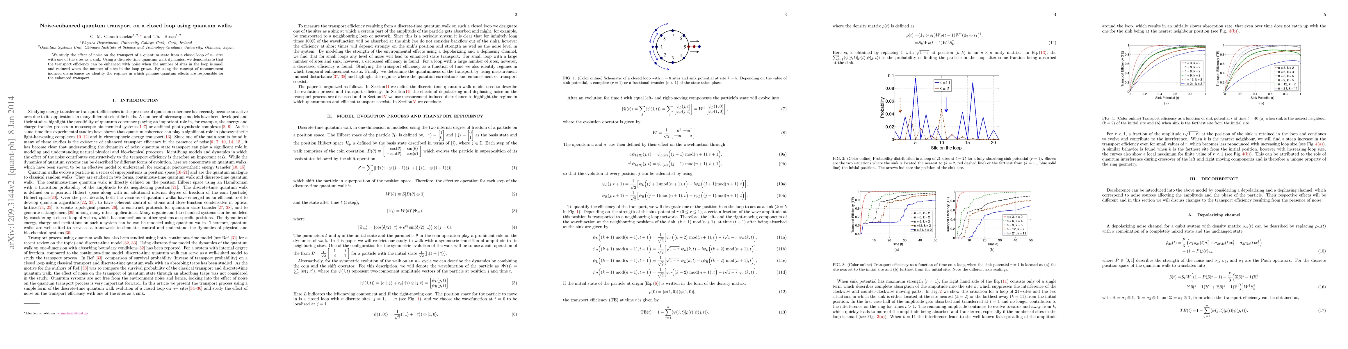 This paper investigates how noise influences quantum transport in a closed loop of $n$-sites using quantum walk dynamics, finding that noise enhances transport efficiency for small loops but reduces it for larger loops, with genuine quantum effects identified in specific regimes.