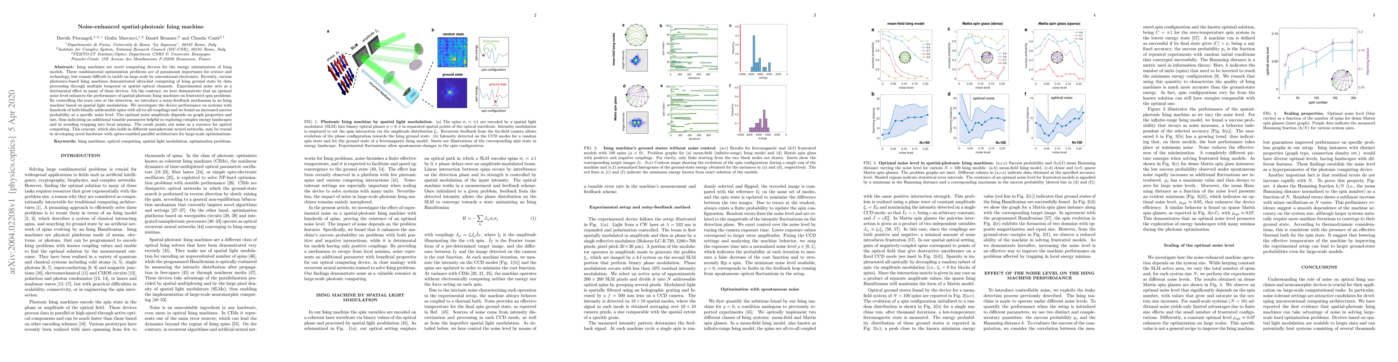 Ising machines are novel computing devices for the energy minimization of Ising models. These combinatorial optimization problems are of paramount importance for science and technology, but remain difficult to tackle on large scale by conventional electronics. Recently, various photonics-based Ising machines demonstrated ultra-fast computing of Ising ground state by data processing through multiple temporal or spatial optical channels. Experimental noise acts as a detrimental effect in many of these devices. On the contrary, we here demonstrate that an optimal noise level enhances the performance of spatial-photonic Ising machines on frustrated spin problems. By controlling the error rate at the detection, we introduce a noisy-feedback mechanism in an Ising machine based on spatial light modulation. We investigate the device performance on systems with hundreds of individually-addressable spins with all-to-all couplings and we found an increased success probability at a specific noise level. The optimal noise amplitude depends on graph properties and size, thus indicating an additional tunable parameter helpful in exploring complex energy landscapes and in avoiding trapping into local minima. The result points out noise as a resource for optical computing. This concept, which also holds in different nanophotonic neural networks, may be crucial in developing novel hardware with optics-enabled parallel architecture for large-scale optimizations.