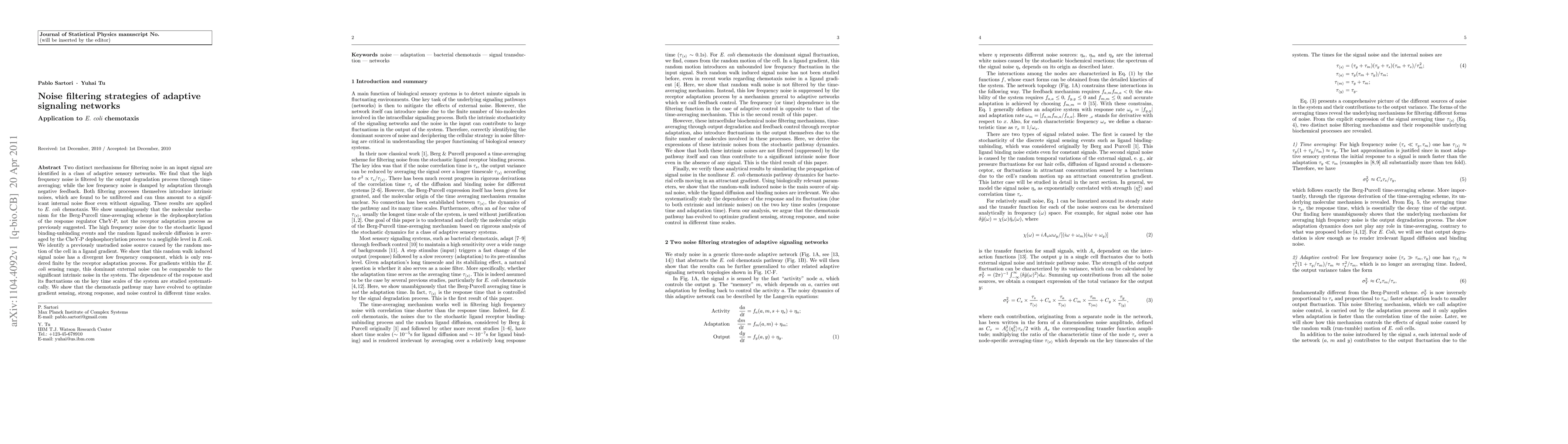 This paper identifies two noise filtering mechanisms in adaptive sensory networks, specifically in E. coli chemotaxis: time-averaging through CheY-P dephosphorylation for high frequency noise and receptor adaptation for low frequency noise. It reveals that both processes introduce intrinsic noise, contributing to a significant internal noise floor.