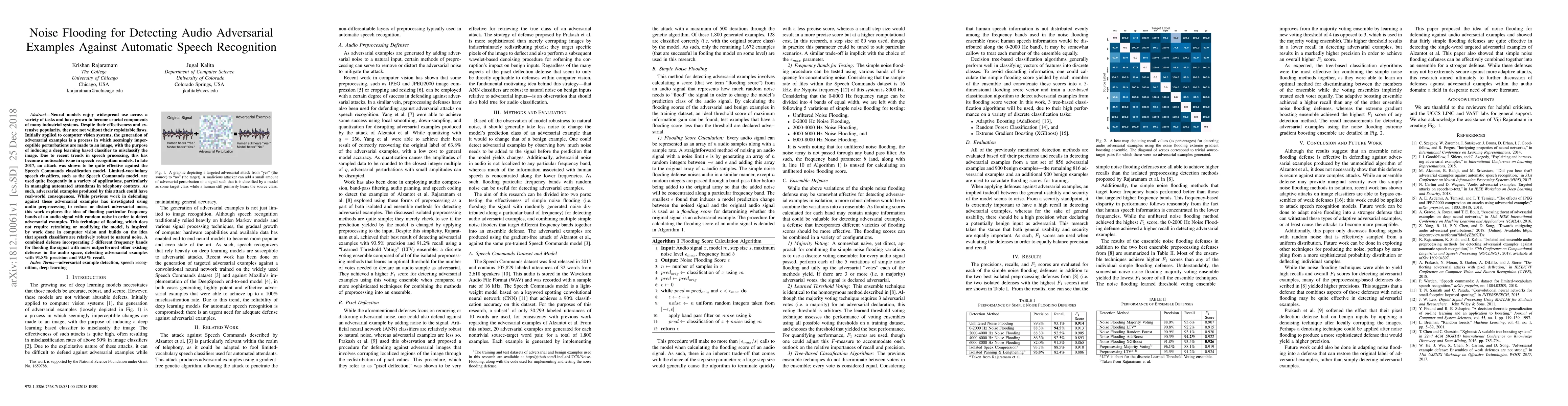Neural models enjoy widespread use across a variety of tasks and have grown to become crucial components of many industrial systems. Despite their effectiveness and extensive popularity, they are not without their exploitable flaws. Initially applied to computer vision systems, the generation of adversarial examples is a process in which seemingly imperceptible perturbations are made to an image, with the purpose of inducing a deep learning based classifier to misclassify the image. Due to recent trends in speech processing, this has become a noticeable issue in speech recognition models. In late 2017, an attack was shown to be quite effective against the Speech Commands classification model. Limited-vocabulary speech classifiers, such as the Speech Commands model, are used quite frequently in a variety of applications, particularly in managing automated attendants in telephony contexts. As such, adversarial examples produced by this attack could have real-world consequences. While previous work in defending against these adversarial examples has investigated using audio preprocessing to reduce or distort adversarial noise, this work explores the idea of flooding particular frequency bands of an audio signal with random noise in order to detect adversarial examples. This technique of flooding, which does not require retraining or modifying the model, is inspired by work done in computer vision and builds on the idea that speech classifiers are relatively robust to natural noise. A combined defense incorporating 5 different frequency bands for flooding the signal with noise outperformed other existing defenses in the audio space, detecting adversarial examples with 91.8% precision and 93.5% recall.
