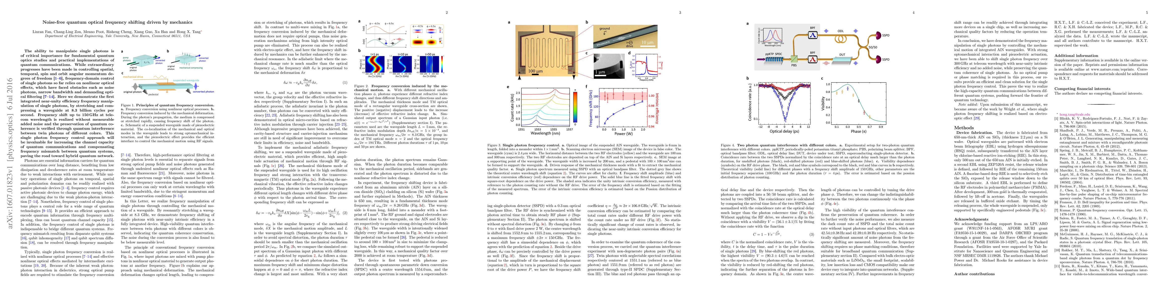 The ability to manipulate single photons is of critical importance for fundamental quantum optics studies and practical implementations of quantum communications. While extraordinary progresses have been made in controlling spatial, temporal, spin and orbit angular momentum degrees of freedom, frequency-domain control of single photons so far relies on nonlinear optical effects, which have faced obstacles such as noise photons, narrow bandwidth and demanding optical filtering. Here we demonstrate the first integrated near-unity efficiency frequency manipulation of single photons, by stretching and compressing a waveguide at 8.3 billion cycles per second. Frequency shift up to 150 GHz at telecom wavelength is realized without measurable added noise and the preservation of quantum coherence is verified through quantum interference between twin photons of different colors. This single photon frequency control approach will be invaluable for increasing the channel capacity of quantum communications and compensating frequency mismatch between quantum systems, paving the road toward hybrid quantum network.