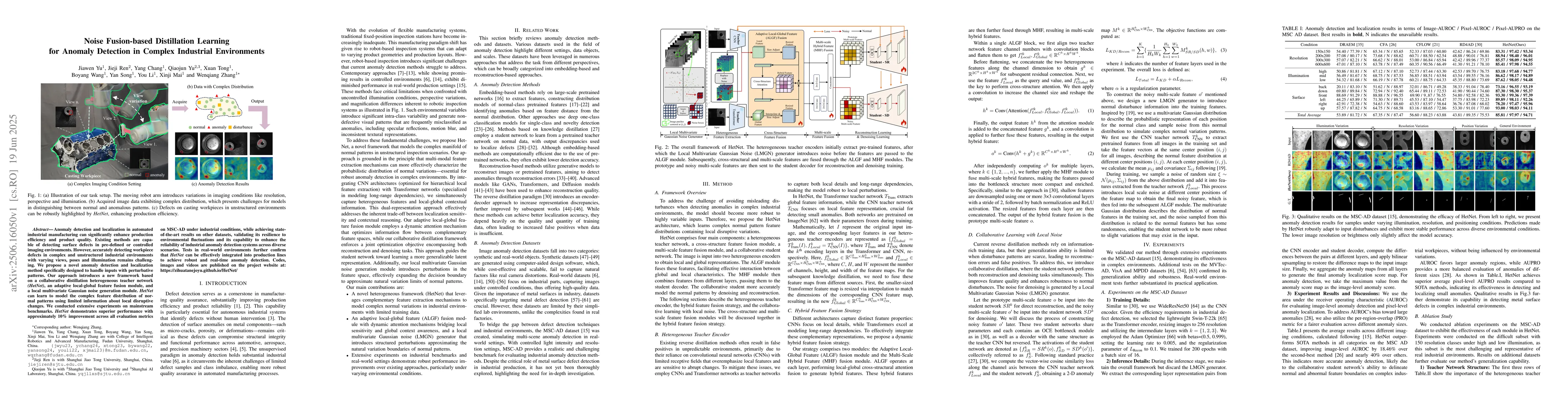 Anomaly detection and localization in automated industrial manufacturing can significantly enhance production efficiency and product quality. Existing methods are capable of detecting surface defects in pre-defined or controlled imaging environments. However, accurately detecting workpiece defects in complex and unstructured industrial environments with varying views, poses and illumination remains challenging. We propose a novel anomaly detection and localization method specifically designed to handle inputs with perturbative patterns. Our approach introduces a new framework based on a collaborative distillation heterogeneous teacher network (HetNet), an adaptive local-global feature fusion module, and a local multivariate Gaussian noise generation module. HetNet can learn to model the complex feature distribution of normal patterns using limited information about local disruptive changes. We conducted extensive experiments on mainstream benchmarks. HetNet demonstrates superior performance with approximately 10% improvement across all evaluation metrics on MSC-AD under industrial conditions, while achieving state-of-the-art results on other datasets, validating its resilience to environmental fluctuations and its capability to enhance the reliability of industrial anomaly detection systems across diverse scenarios. Tests in real-world environments further confirm that HetNet can be effectively integrated into production lines to achieve robust and real-time anomaly detection. Codes, images and videos are published on the project website at: https://zihuatanejoyu.github.io/HetNet/