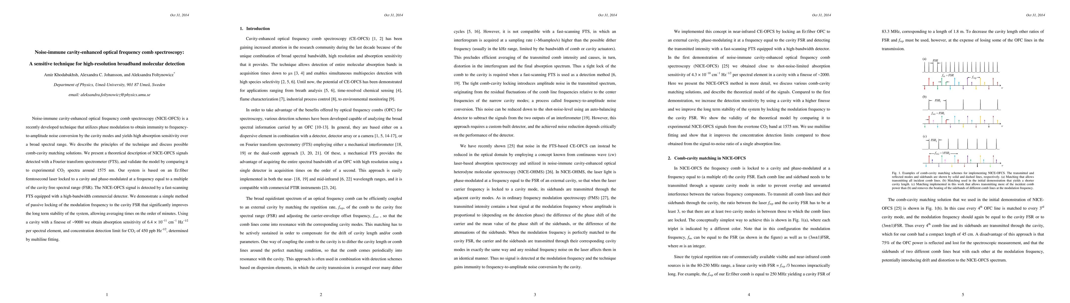 Noise-immune cavity-enhanced optical frequency comb spectroscopy (NICE-OFCS) provides high-resolution broadband molecular detection by utilizing phase modulation to achieve immunity to noise conversion. This technique demonstrates absorption sensitivity and a concentration detection limit for CO2 of 450 ppb Hz^{-1/2}, validated through comparison with experimental CO2 spectra.