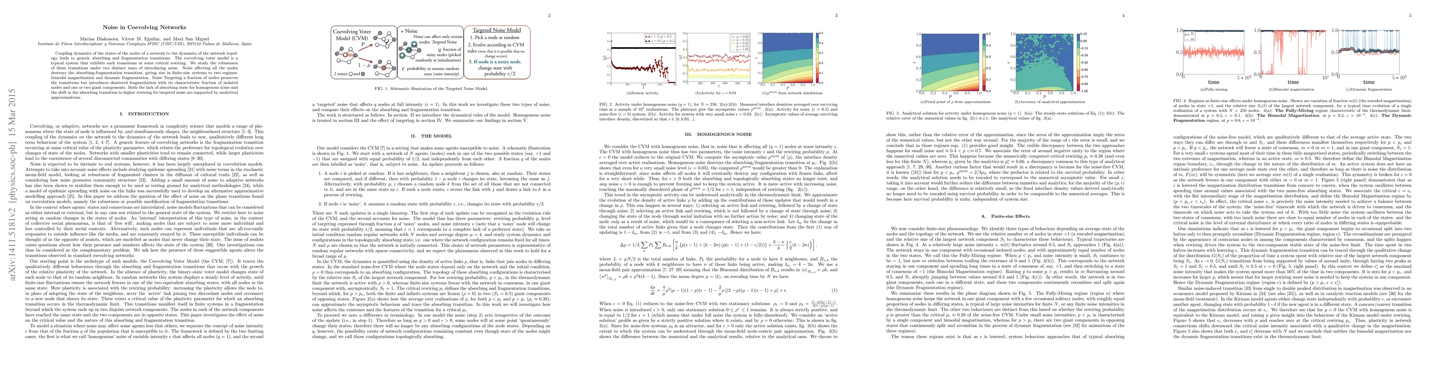 Coupling dynamics of the states of the nodes of a network to the dynamics of the network topology leads to generic absorbing and fragmentation transitions. The coevolving voter model is a typical system that exhibits such transitions at some critical rewiring. We study the robustness of these transitions under two distinct ways of introducing noise. Noise affecting all the nodes destroys the absorbing-fragmentation transition, giving rise in finite-size systems to two regimes: bimodal magnetisation and dynamic fragmentation. Noise Targeting a fraction of nodes preserves the transitions but introduces shattered fragmentation with its characteristic fraction of isolated nodes and one or two giant components. Both the lack of absorbing state for homogenous noise and the shift in the absorbing transition to higher rewiring for targeted noise are supported by analytical approximations.