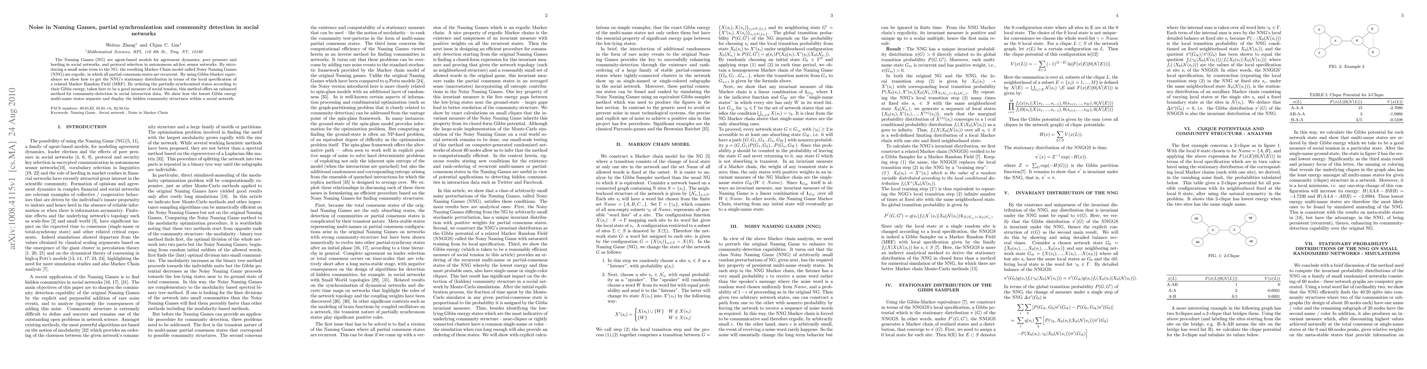 This paper introduces Noisy Naming Games (NNG), an extension of Naming Games that incorporates noise to model agreement dynamics in social networks. It uses Gibbs-Markov equivalence to derive NNG's stationary distribution and leverages Gibbs energy to enhance community detection, revealing hidden social structures through partially synchronized states.