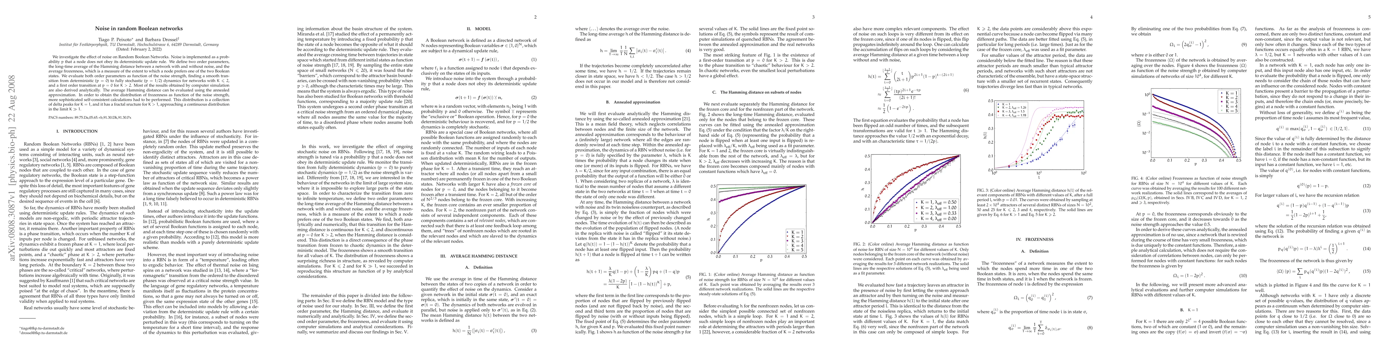 We investigate the effect of noise on Random Boolean Networks. Noise is implemented as a probability $p$ that a node does not obey its deterministic update rule. We define two order parameters, the long-time average of the Hamming distance between a network with and without noise, and the average frozenness, which is a measure of the extent to which a node prefers one of the two Boolean states. We evaluate both order parameters as function of the noise strength, finding a smooth transition from deterministic ($p=0$) to fully stochastic ($p=1/2$) dynamics for networks with $K\le2$, and a first order transition at $p=0$ for $K>2$. Most of the results obtained by computer simulation are also derived analytically. The average Hamming distance can be evaluated using the annealed approximation. In order to obtain the distribution of frozenness as function of the noise strength, more sophisticated self-consistent calculations had to be performed. This distribution is a collection of delta peaks for K=1, and it has a fractal sructure for $K>1$, approaching a continuous distribution in the limit $K\gg1$.