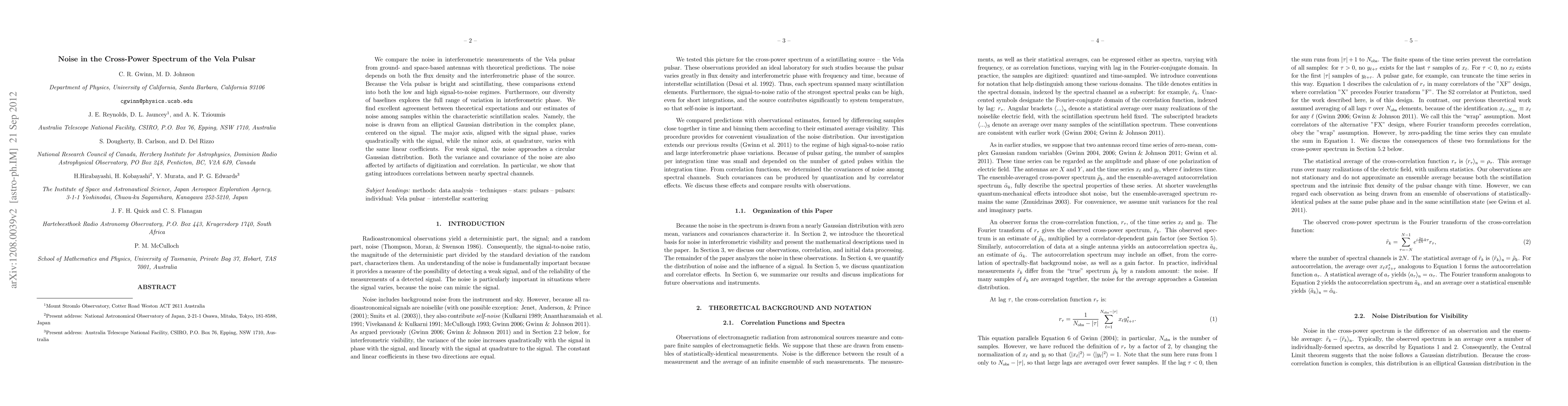 We compare the noise in interferometric measurements of the Vela pulsar from ground- and space-based antennas with theoretical predictions. The noise depends on both the flux density and the interferometric phase of the source. Because the Vela pulsar is bright and scintillating, these comparisons extend into both the low and high signal-to-noise regimes. Furthermore, our diversity of baselines explores the full range of variation in interferometric phase. We find excellent agreement between theoretical expectations and our estimates of noise among samples within the characteristic scintillation scales. Namely, the noise is drawn from an elliptical Gaussian distribution in the complex plane, centered on the signal. The major axis, aligned with the signal phase, varies quadratically with the signal, while the minor axis, at quadrature, varies with the same linear coefficients. For weak signal, the noise approaches a circular Gaussian distribution. Both the variance and covariance of the noise are also affected by artifacts of digitization and correlation. In particular, we show that gating introduces correlations between nearby spectral channels.