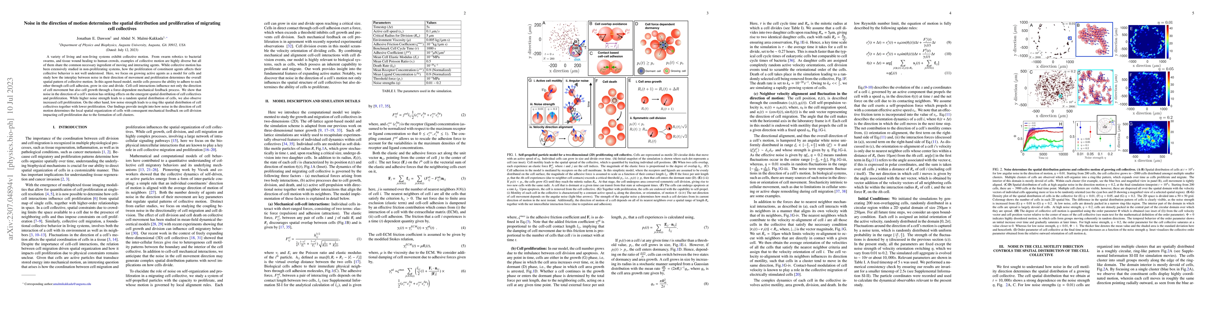 This paper investigates how noise in the direction of motion and proliferation of migrating cell collectives affect their spatial distribution and growth patterns. The study reveals that higher noise leads to random cell distribution and increased proliferation, while lower noise results in ring-like spatial patterns and reduced proliferation, highlighting the interplay between motion noise and mechanical feedback on cell division.