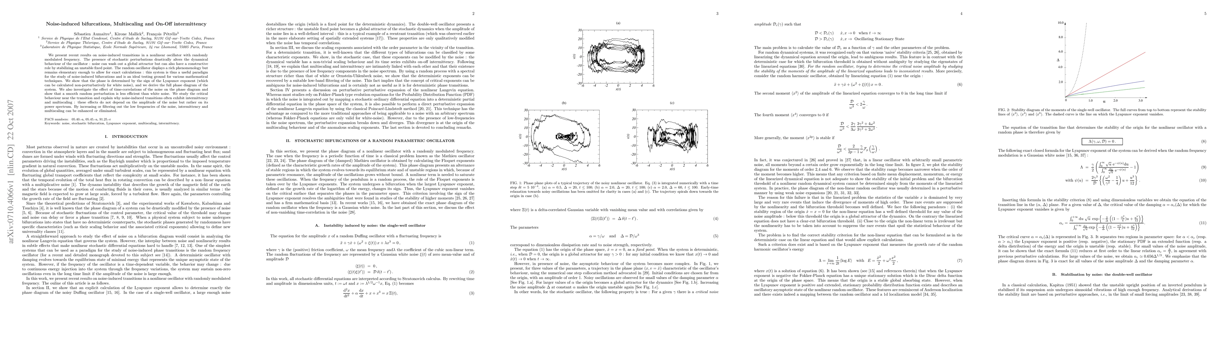 We present recent results on noise-induced transitions in a nonlinear oscillator with randomly modulated frequency. The presence of stochastic perturbations drastically alters the dynamical behaviour of the oscillator: noise can wash out a global attractor but can also have a constructive role by stabilizing an unstable fixed point. The random oscillator displays a rich phenomenology but remains elementary enough to allow for exact calculations: this system is thus a useful paradigm for the study of noise-induced bifurcations and is an ideal testing ground for various mathematical techniques. We show that the phase is determined by the sign of the Lyapunov exponent (which can be calculated non-perturbatively for white noise), and we derive the full phase diagram of the system. We also investigate the effect of time-correlations of the noise on the phase diagram and show that a smooth random perturbation is less efficient than white noise. We study the critical behaviour near the transition and explain why noise-induced transitions often exhibit intermittency and multiscaling: these effects do not depend on the amplitude of the noise but rather on its power spectrum. By increasing or filtering out the low frequencies of the noise, intermittency and multiscaling can be enhanced or eliminated.