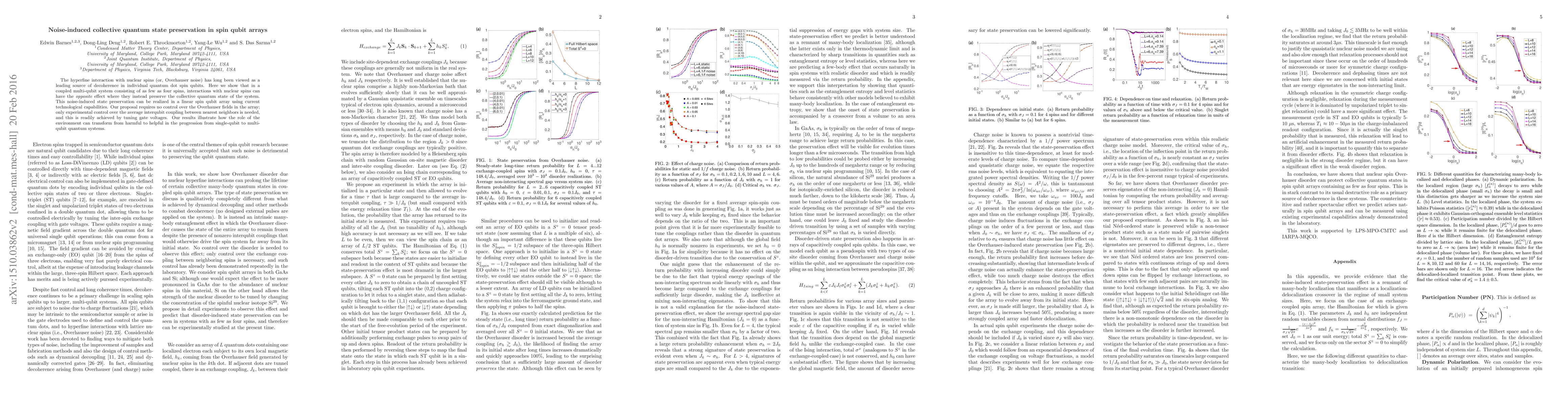 The hyperfine interaction with nuclear spins (or, Overhauser noise) has long been viewed as a leading source of decoherence in individual quantum dot spin qubits. Here we show that in a coupled multi-qubit system consisting of as few as four spins, interactions with nuclear spins can have the opposite effect where they instead preserve the collective quantum state of the system. This noise-induced state preservation can be realized in a linear spin qubit array using current technological capabilities. Our proposal requires no control over the Overhauser fields in the array; only experimental control over the average interqubit coupling between nearest neighbors is needed, and this is readily achieved by tuning gate voltages. Our results illustrate how the role of the environment can transform from harmful to helpful in the progression from single-qubit to multi-qubit quantum systems.