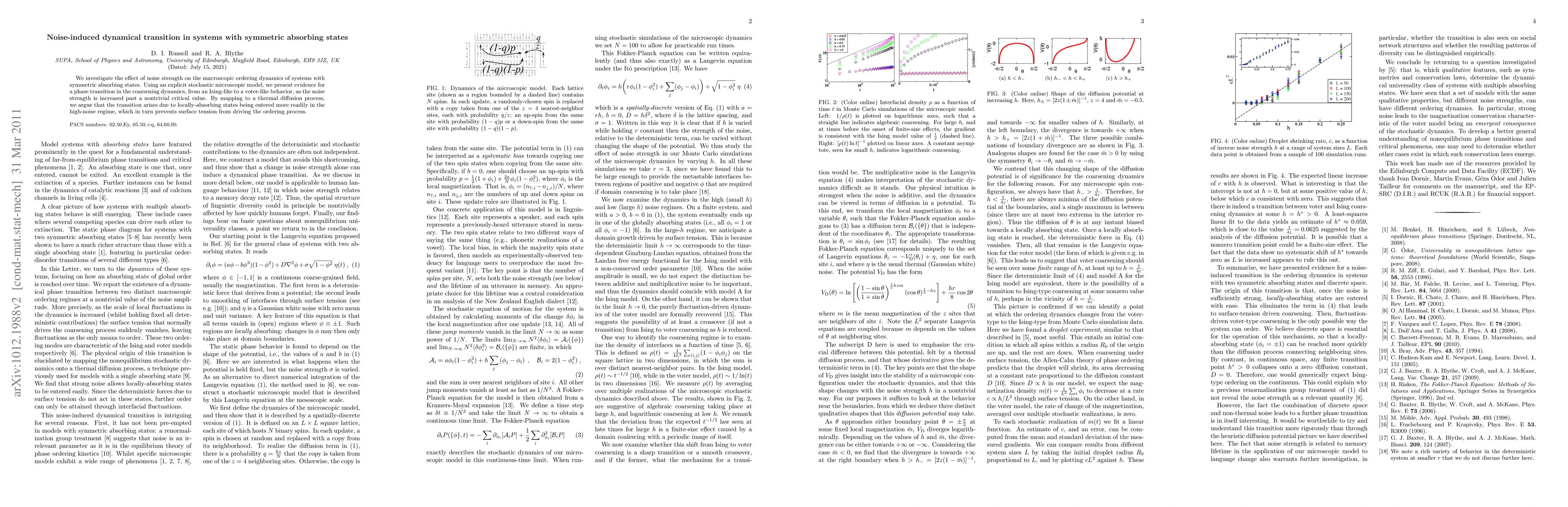 This paper explores how varying noise strength influences the macroscopic ordering dynamics in systems with symmetric absorbing states, revealing a phase transition from Ising-like to voter-like behavior at a critical noise level, attributed to high-noise facilitating entry into locally-absorbing states and hindering surface tension-driven ordering.