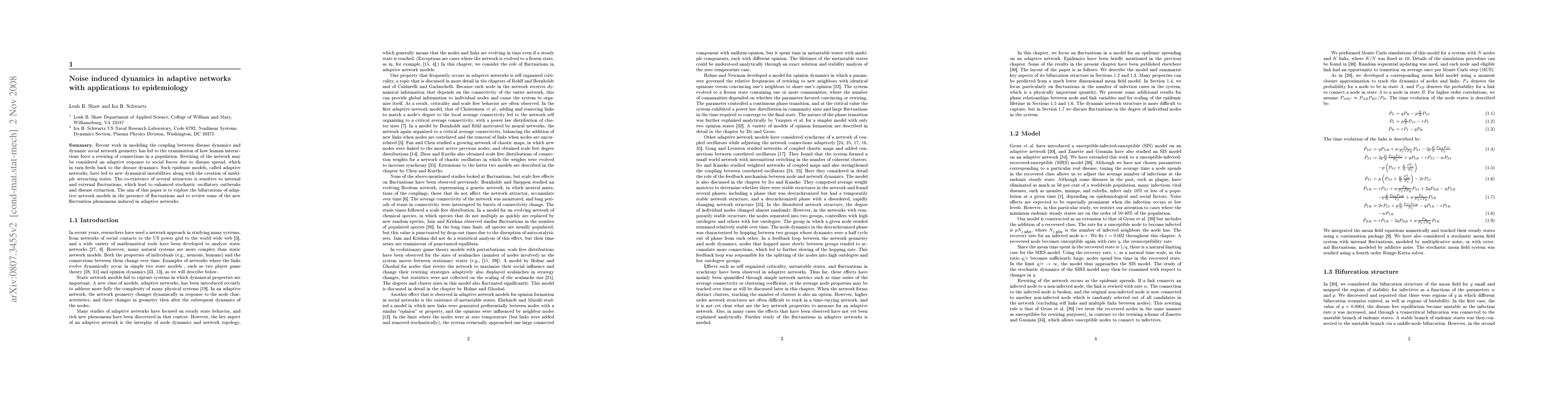 Recent work in modeling the coupling between disease dynamics and dynamic social network geometry has led to the examination of how human interactions force a rewiring of connections in a population. Rewiring of the network may be considered an adaptive response to social forces due to disease spread, which in turn feeds back to the disease dynamics. Such epidemic models, called adaptive networks, have led to new dynamical instabilities along with the creation of multiple attracting states. The co-existence of several attractors is sensitive to internal and external fluctuations, and leads to enhanced stochastic oscillatory outbreaks and disease extinction. The aim of this paper is to explore the bifurcations of adaptive network models in the presence of fluctuations and to review some of the new fluctuation phenomena induced in adaptive networks.