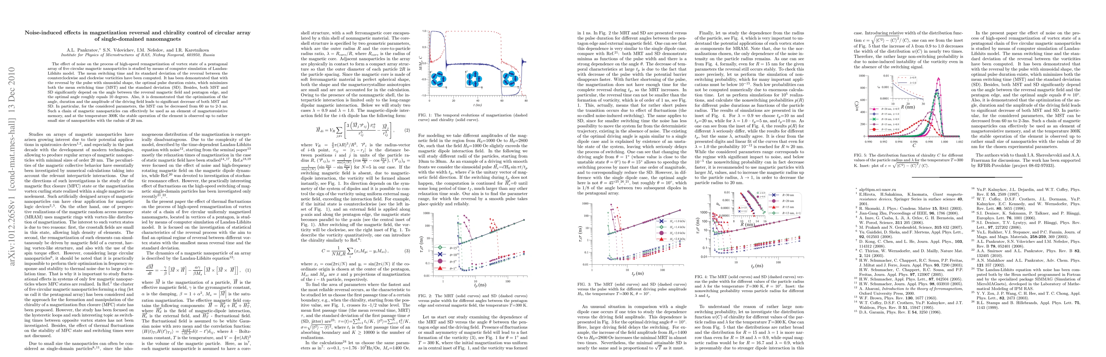 The effect of noise on the process of high-speed remagnetization of vortex state of a pentagonal array of five circular magnetic nanoparticles is studied by means of computer simulation of Landau-Lifshits model. The mean switching time and its standard deviation of the reversal between the counterclockwise and clockwise vorticities have been computed. It has been demonstrated that with the reversal by the pulse with sinusoidal shape, the optimal pulse duration exists, which minimizes both the mean switching time (MST) and the standard deviation (SD). Besides, both MST and SD significantly depend on the angle between the reversal magnetic field and pentagon edge, and the optimal angle roughly equals 10 degrees. Also, it is demonstrated that the optimization of the angle, duration and the amplitude of the driving field leads to significant decrease of both MST and SD. In particular, for the considered parameters, the MST can be decreased from 60 ns to 2-3 ns. Such a chain of magnetic nanoparticles can effectively be used as an element of magnetoresistive memory, and at the temperature 300K the stable operation of the element is observed up to rather small size of nanoparticles with the raduis of 20 nm.