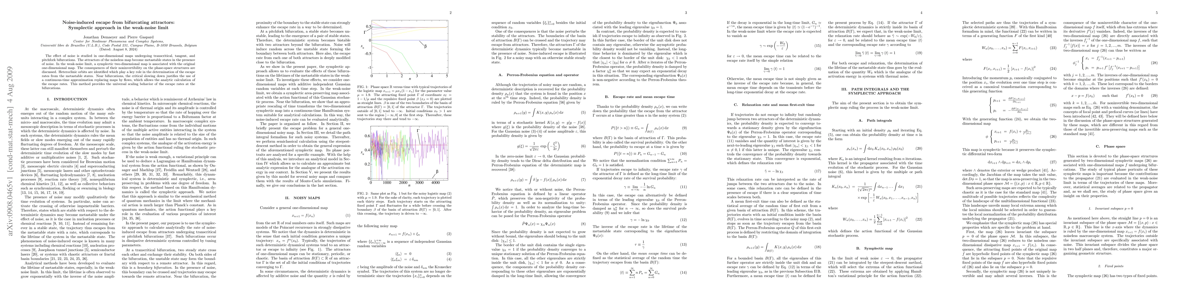 This paper investigates the impact of noise on one-dimensional maps undergoing various bifurcations, revealing metastable states in the presence of weak noise. It employs a symplectic approach to analyze the phase-space structures and identifies heteroclinic orbits crucial for escape rates, providing a universal scaling behavior near bifurcations.