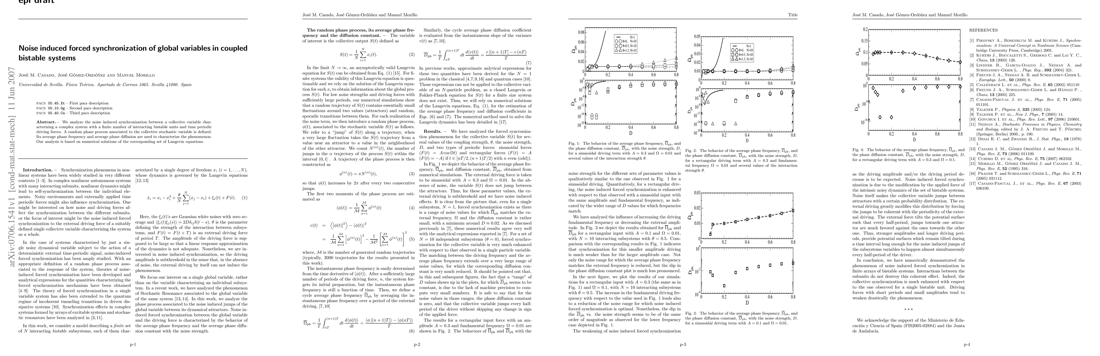 We analyze the noise induced synchronization between a collective variable characterizing a complex system with a finite number of interacting bistable units and time periodic driving forces. A random phase process associated to the collective stochastic variable is defined. Its average phase frequency and average phase diffusion are used to characterize the phenomenon. Our analysis is based on numerical solutions of the corresponding set of Langevin equations.