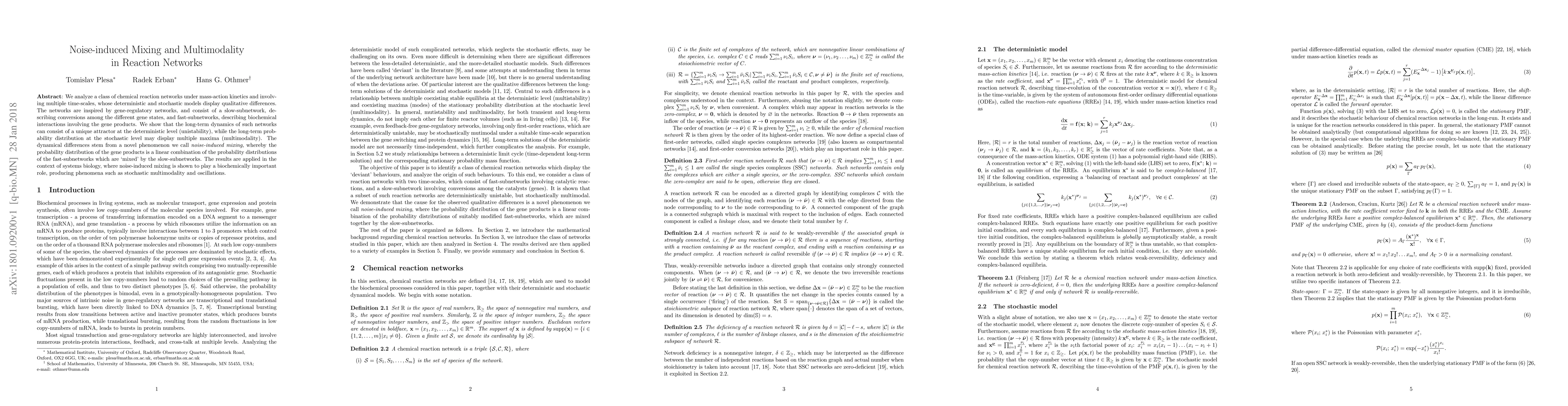 We analyze a class of chemical reaction networks under mass-action kinetics and involving multiple time-scales, whose deterministic and stochastic models display qualitative differences. The networks are inspired by gene-regulatory networks, and consist of a slow-subnetwork, describing conversions among the different gene states, and fast-subnetworks, describing biochemical interactions involving the gene products. We show that the long-term dynamics of such networks can consist of a unique attractor at the deterministic level (unistability), while the long-term probability distribution at the stochastic level may display multiple maxima (multimodality). The dynamical differences stem from a novel phenomenon we call noise-induced mixing, whereby the probability distribution of the gene products is a linear combination of the probability distributions of the fast-subnetworks which are `mixed' by the slow-subnetworks. The results are applied in the context of systems biology, where noise-induced mixing is shown to play a biochemically important role, producing phenomena such as stochastic multimodality and oscillations.