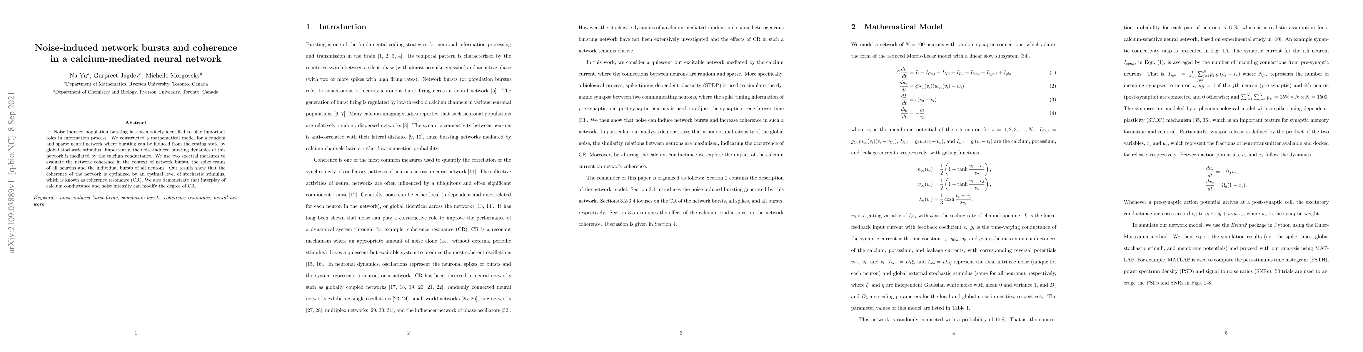 Noise-induced population bursting has been widely identified to play important roles in the information process. We constructed a mathematical model for a random and sparse neural network where bursting can be induced from the resting state by the global stochastic stimulus. Importantly, the noise-induced bursting dynamics of this network are mediated by calcium conductance. We use two spectral measures to evaluate the network coherence in the context of network bursts, the spike trains of all neurons and the individual bursts of all neurons. Our results show that the coherence of the network is optimized by an optimal level of stochastic stimulus, which is known as coherence resonance (CR). We also demonstrate that the interplay of calcium conductance and noise intensity can modify the degree of CR.