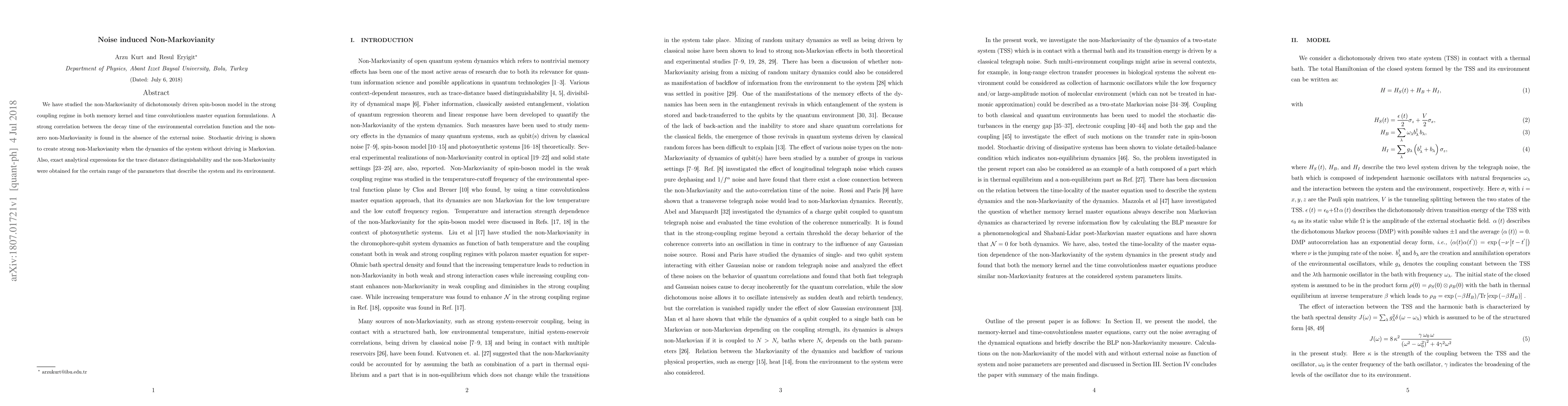 We have studied the non-Markovianity of dichotomously driven spin-boson model in the strong coupling regime in both memory kernel and time convolutionless master equation formulations. A strong correlation between the decay time of the environmental correlation function and the non-zero non-Markovianity is found in the absence of the external noise. Stochastic driving is shown to create strong non-Markovianity when the dynamics of the system without driving is Markovian. Also, exact analytical expressions for the trace distance distinguishability and the non-Markovianity were obtained for the certain range of the parameters that describe the system and its environment.