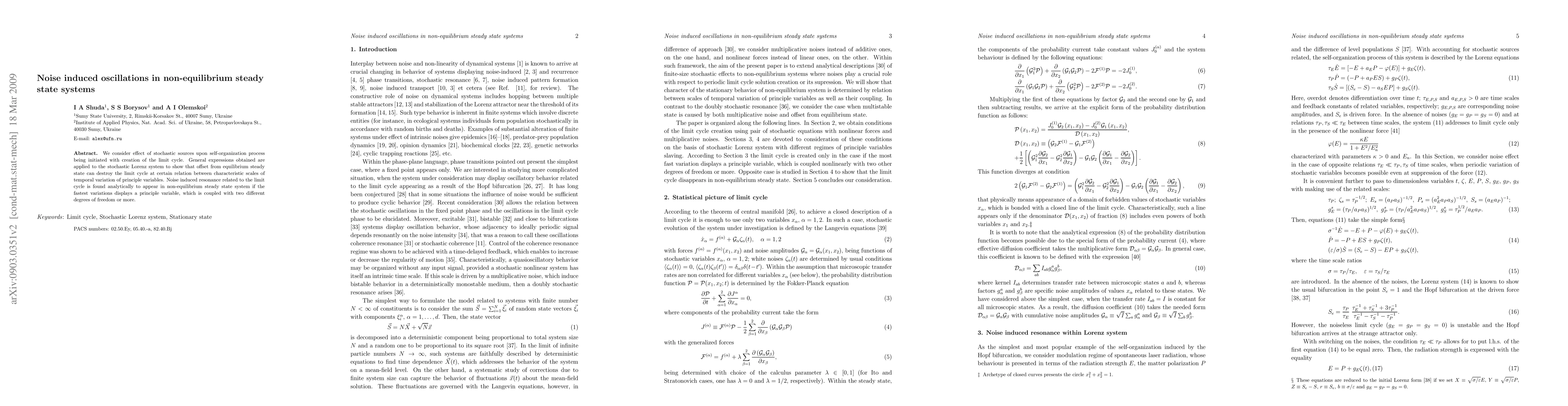We consider effect of stochastic sources upon self-organization process being initiated with creation of the limit cycle. General expressions obtained are applied to the stochastic Lorenz system to show that departure from equilibrium steady state can destroy the limit cycle at certain relation between characteristic scales of temporal variation of principle variables. Noise induced resonance related to the limit cycle is found to appear if the fastest variations displays a principle variable, which is coupled with two different degrees of freedom or more.