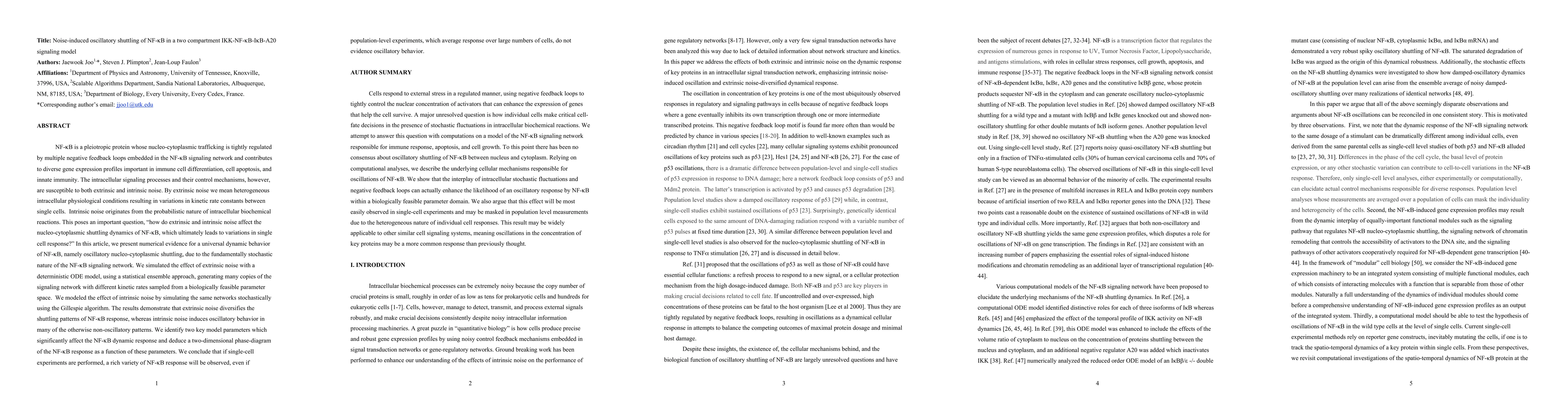 This paper investigates the oscillatory shuttling behavior of NF-{\kappa}B in a two-compartment signaling model, demonstrating that both extrinsic and intrinsic noise can induce diverse dynamic responses. The study reveals that extrinsic noise diversifies shuttling patterns, while intrinsic noise often leads to oscillations, highlighting the stochastic nature of NF-{\kappa}B signaling.