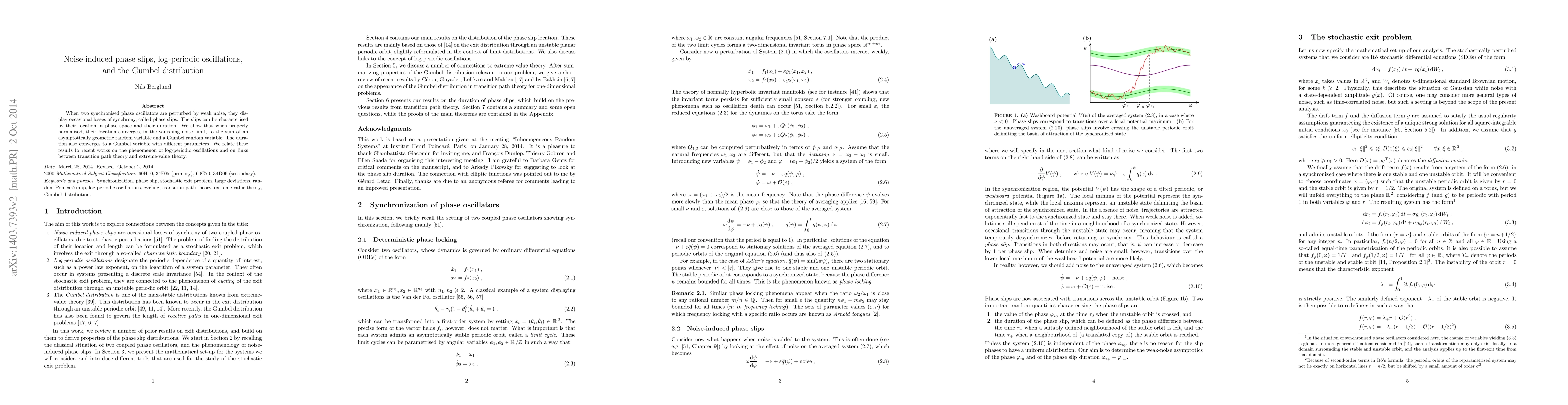 When two synchronised phase oscillators are perturbed by weak noise, they display occasional losses of synchrony, called phase slips. The slips can be characterised by their location in phase space and their duration. We show that when properly normalised, their location converges, in the vanishing noise limit, to the sum of an asymptotically geometric random variable and a Gumbel random variable. The duration also converges to a Gumbel variable with different parameters. We relate these results to recent works on the phenomenon of log-periodic oscillations and on links between transition path theory and extreme-value theory.