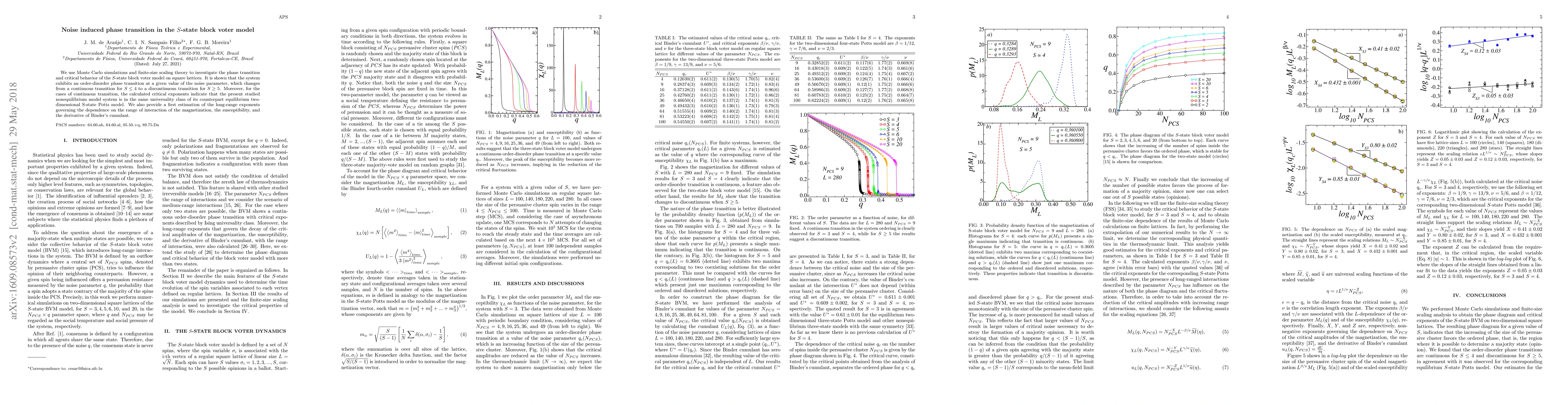 We use Monte Carlo simulations and finite-size scaling theory to investigate the phase transition and critical behavior of the $S$-state block voter model on square lattices. It is shown that the system exhibits an order-disorder phase transition at a given value of the noise parameter, which changes from a continuous transition for $S\le4$ to a discontinuous transition for $S\ge5$. Moreover, for the cases of continuous transition, the calculated critical exponents indicate that the present studied nonequilibrium model system is in the same universality class of its counterpart equilibrium two-dimensional S-state Potts model. We also provide a first estimation of the long-range exponents governing the dependence on the range of interaction of the magnetization, the susceptibility, and the derivative of Binder's cumulant.