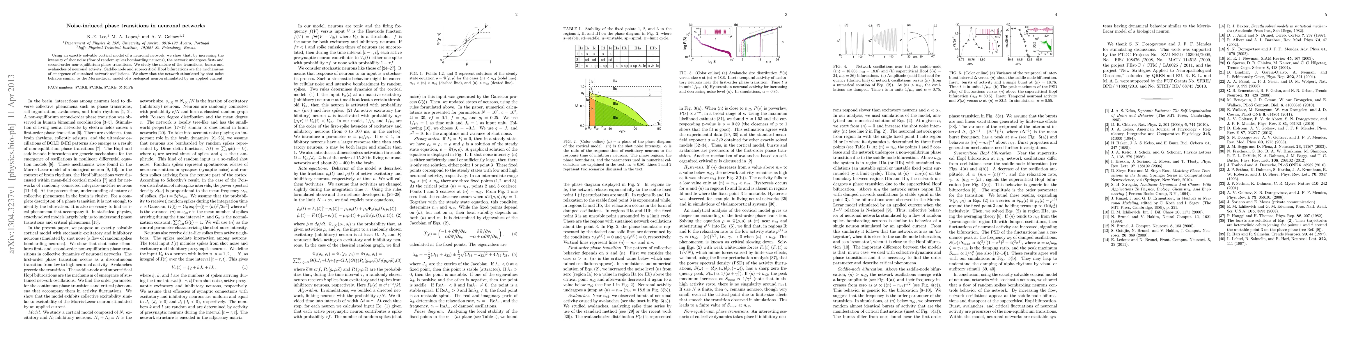 Using an exactly solvable cortical model of a neuronal network, we show that, by increasing the intensity of shot noise (flow of random spikes bombarding neurons), the network undergoes first- and second-order non-equilibrium phase transitions. We study the nature of the transitions, bursts and avalanches of neuronal activity. Saddle-node and supercritical Hopf bifurcations are the mechanisms of emergence of sustained network oscillations. We show that the network stimulated by shot noise behaves similar to the Morris-Lecar model of a biological neuron stimulated by an applied current.