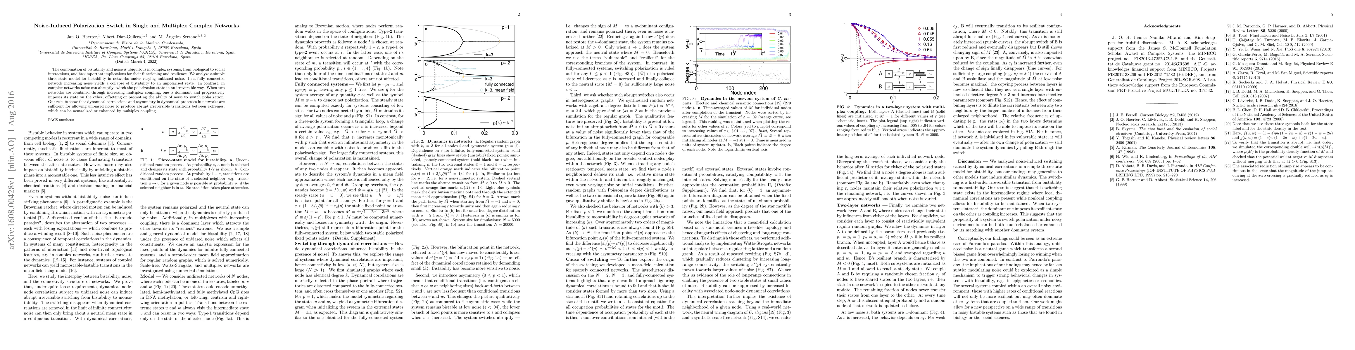This paper investigates how noise affects bistability in complex networks, revealing that while noise can collapse bistability in fully connected networks, it can induce abrupt irreversible polarization switches in complex networks. The study also explores how combining networks through multiplex coupling can either offset or enhance these noise-induced transitions.