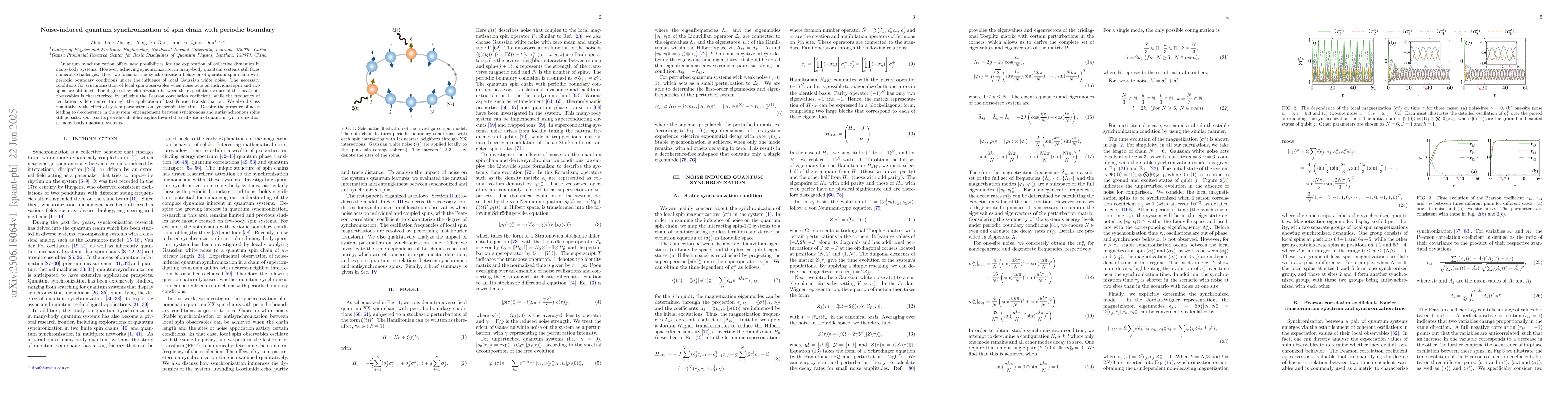 Quantum synchronization offers new possibilities for the exploration of collective dynamics in many-body systems. However, achieving synchronization in many-body quantum systems still faces numerous challenges. Here, we focus on the synchronization behavior of quantum spin chain with periodic boundary conditions under the influence of local Gaussian white noise. The necessary conditions for synchronization of local spin observables when noise acts on individual spin and two spins are obtained. The degree of synchronization between the expectation values of the local spin observables is characterized by utilizing the Pearson correlation coefficient, while the frequency of oscillation is determined through the application of fast Fourier transformation. We also discuss qualitatively the effect of system parameters on synchronization time. Despite the presence of noise leading to decoherence in the system, entanglement between synchronous and antisynchronous spins still persists. Our results provide valuable insights toward the realization of quantum synchronization in many-body quantum systems.