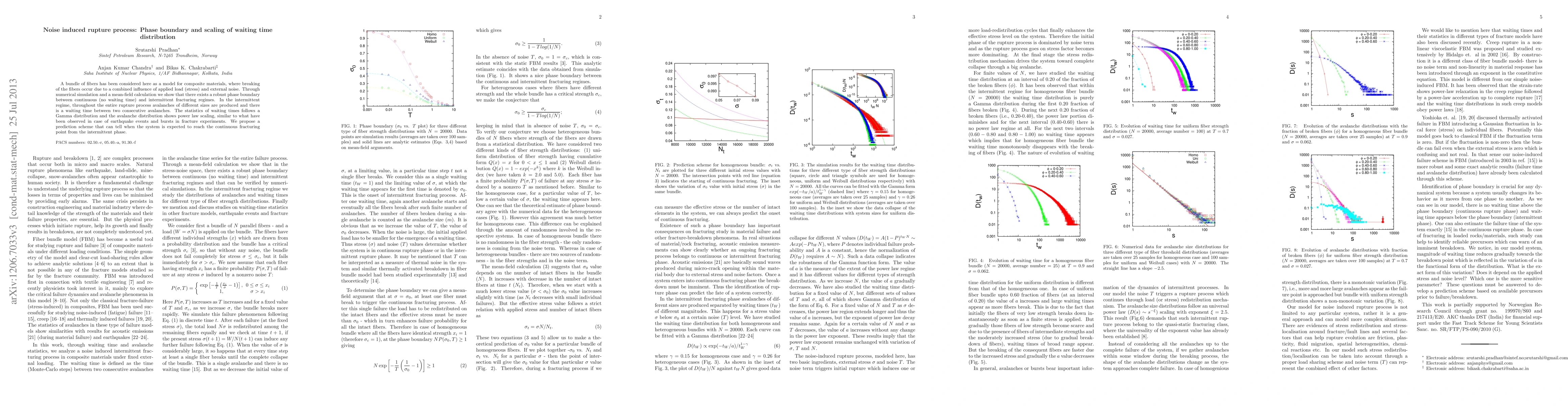 A bundle of fibers has been considered here as a model for composite materials, where breaking of the fibers occur due to a combined influence of applied load (stress) and external noise. Through numerical simulation and a mean-field calculation we show that there exists a robust phase boundary between continuous (no waiting time) and intermittent fracturing regimes. In the intermittent regime, throughout the entire rupture process avalanches of different sizes are produced and there is a waiting time between two consecutive avalanches. The statistics of waiting times follows a Gamma distribution and the avalanche distribution shows power law scaling, similar to what have been observed in case of earthquake events and bursts in fracture experiments. We propose a prediction scheme that can tell when the system is expected to reach the continuous fracturing point from the intermittent phase.