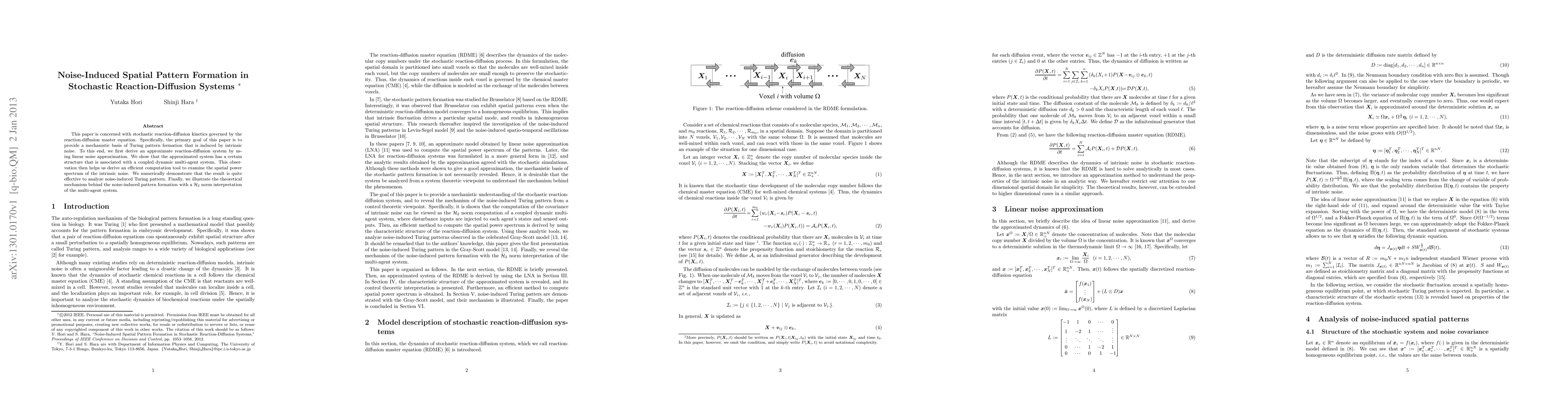 This paper is concerned with stochastic reaction-diffusion kinetics governed by the reaction-diffusion master equation. Specifically, the primary goal of this paper is to provide a mechanistic basis of Turing pattern formation that is induced by intrinsic noise. To this end, we first derive an approximate reaction-diffusion system by using linear noise approximation. We show that the approximated system has a certain structure that is associated with a coupled dynamic multi-agent system. This observation then helps us derive an efficient computation tool to examine the spatial power spectrum of the intrinsic noise. We numerically demonstrate that the result is quite effective to analyze noise-induced Turing pattern. Finally, we illustrate the theoretical mechanism behind the noise-induced pattern formation with a H2 norm interpretation of the multi-agent system.