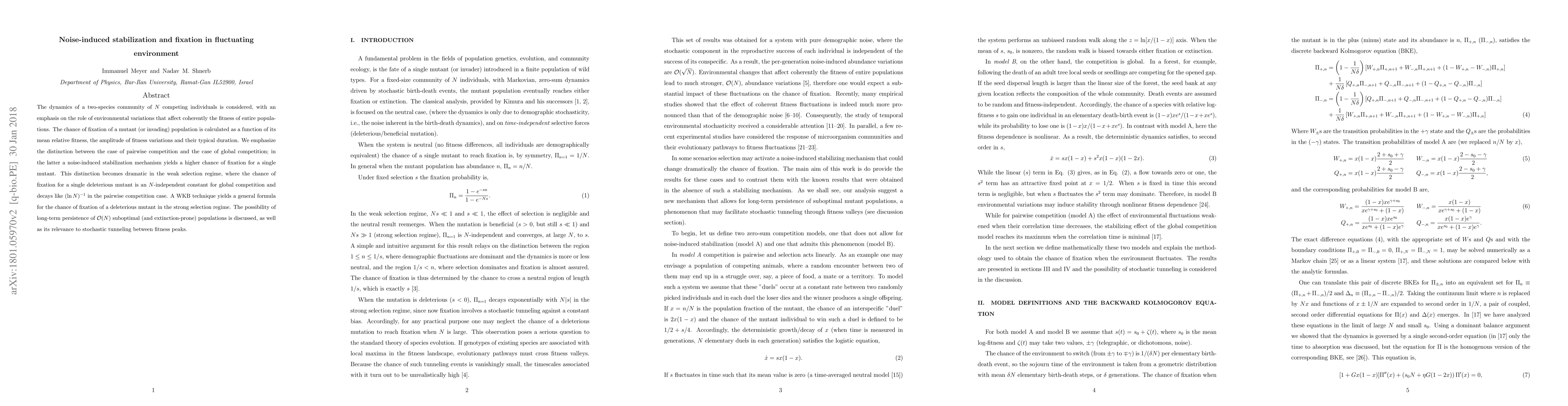 The dynamics of a two-species community of $N$ competing individuals is considered, with an emphasis on the role of environmental variations that affect coherently the fitness of entire populations. The chance of fixation of a mutant population (and, in particular, of a single mutant) is calculated as a function of the mean relative fitness of the mutant, the amplitude of fitness variations and their typical duration. We emphasize the distinction between the case of local competition and the case of global competition; in the latter a noise-induced stabilization mechanism yields a higher chance of fixation for a single mutant. The distinction becomes dramatic in the weak selection phase, where the chance of fixation for a single deleterious mutant is an $N$-independent constant for global competition and decays like $(\ln N)^{-1}$ in the local competition case. The possibility of long-term persistence of ${\cal O} (N)$ suboptimal (and extinction-prone) populations is discussed, as well as its relevance to stochastic tunneling between fitness peaks.