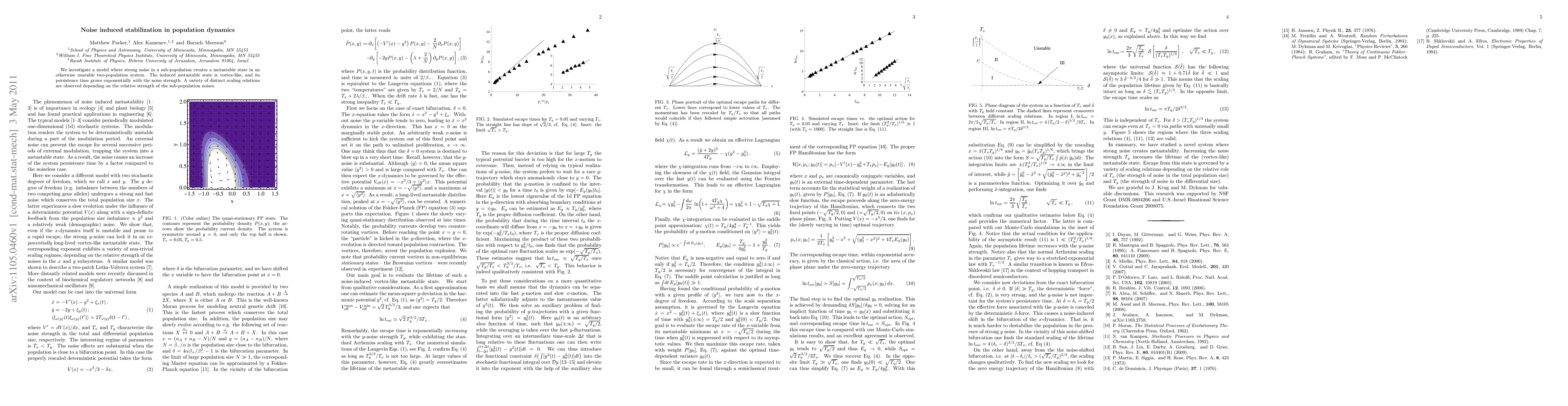We investigate a model where strong noise in a sub-population creates a metastable state in an otherwise unstable two-population system. The induced metastable state is vortex-like, and its persistence time grows exponentially with the noise strength. A variety of distinct scaling relations are observed depending on the relative strength of the sub-population noises.