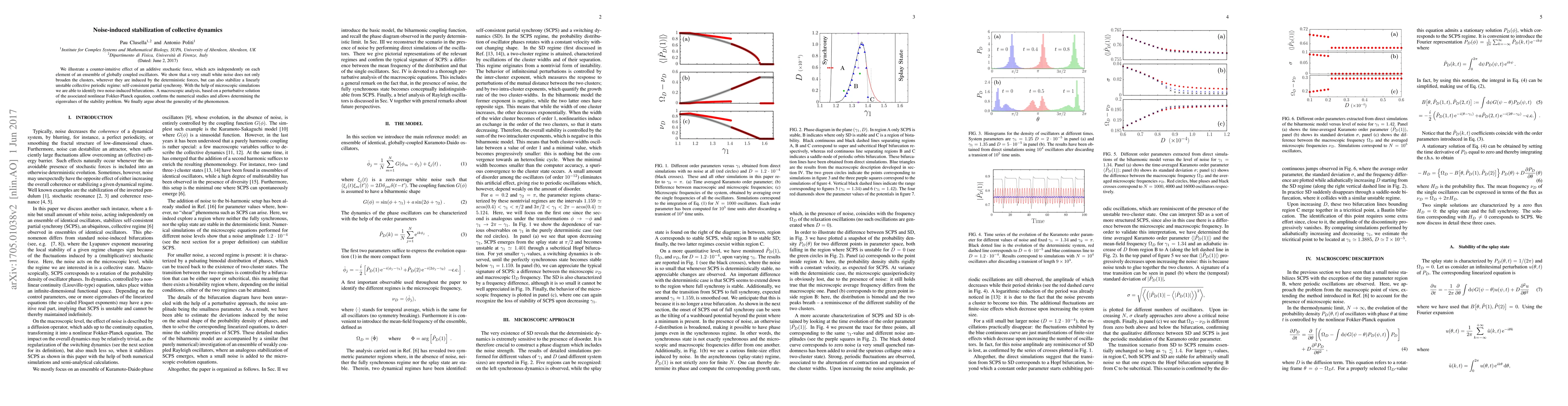We illustrate a counter-intuitive effect of an additive stochastic force, which acts independently on each element of an ensemble of globally coupled oscillators. We show numerically and semi-analytically that a very small white noise is able to stabilize an otherwise linearly unstable collective periodic regime. Microscopic simulations reveal two noise-induced bifurcations of different nature towards self-consistent partial synchrony. We develop a macroscopic treatment solving the corresponding nonlinear Fokker-Planck equation by means of a perturbative approach. The associated linear stability analysis confirms the results anticipated by the numerics. We also argue about the generality of the phenomenon.
